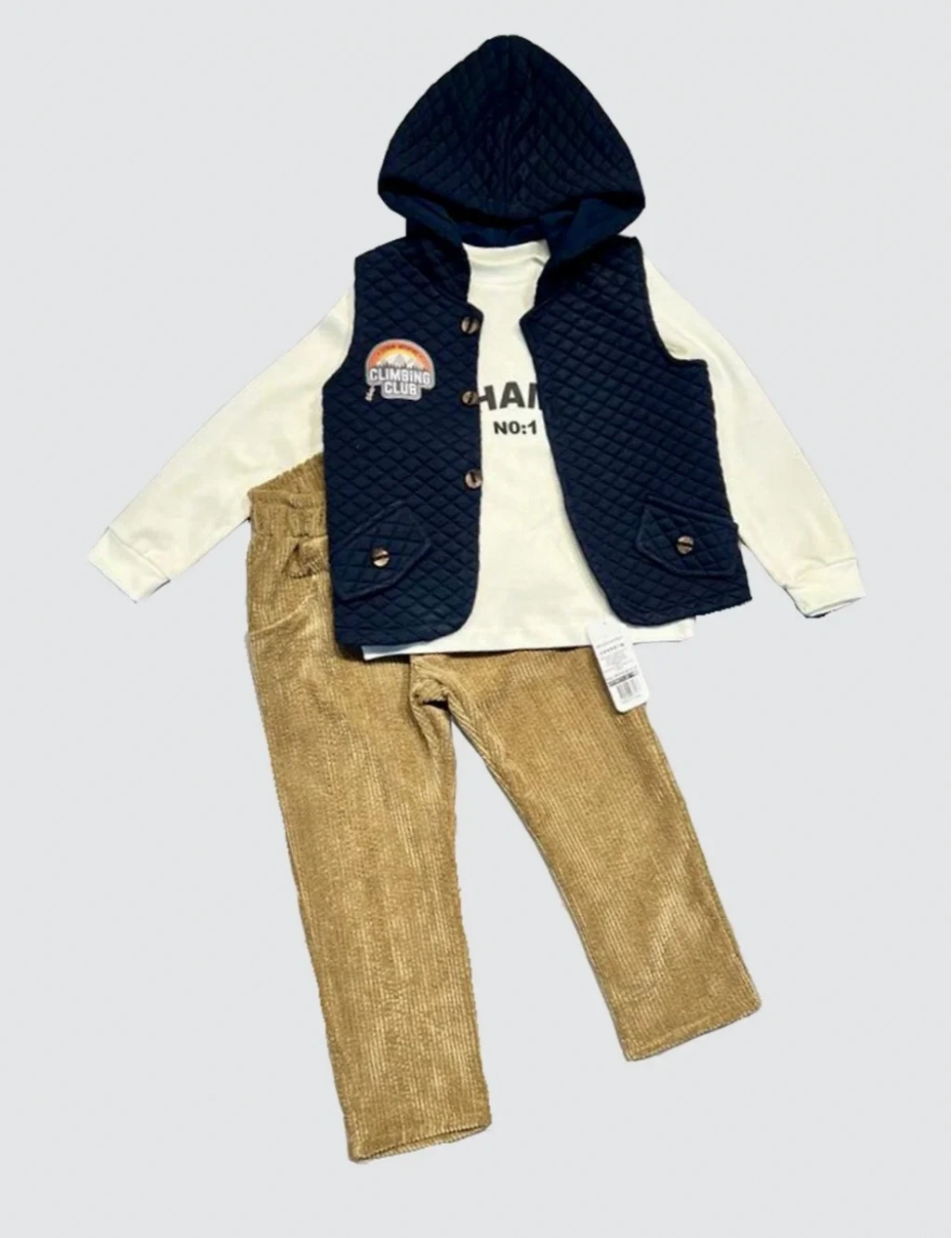 3-4-5 Yaş Fitilli Kadife Pantolon Kapitone Kapşonlu Yelek Uzun Kollu Sweat 3lü Erkek Çocuk Takımı Lacivert