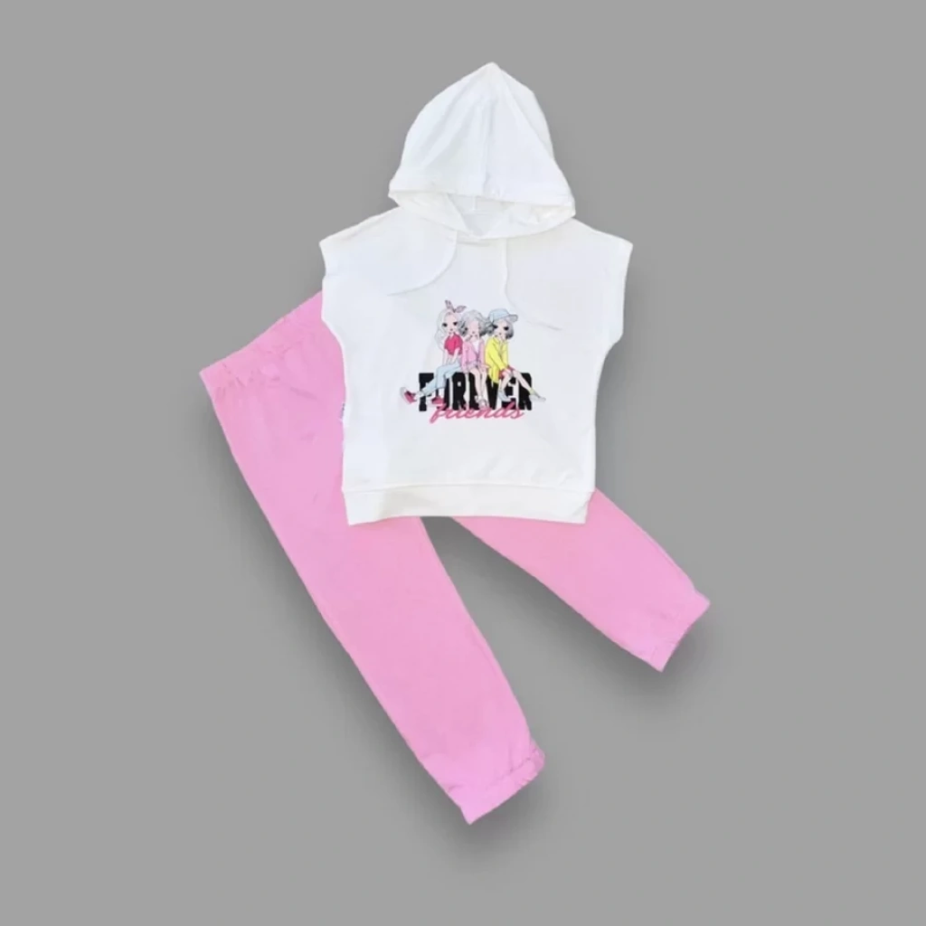 3-4-5 Yaş Forever Cici Kızlar Baskılı Kapşonlu 2li Kız Çocuk Takımı Pembe