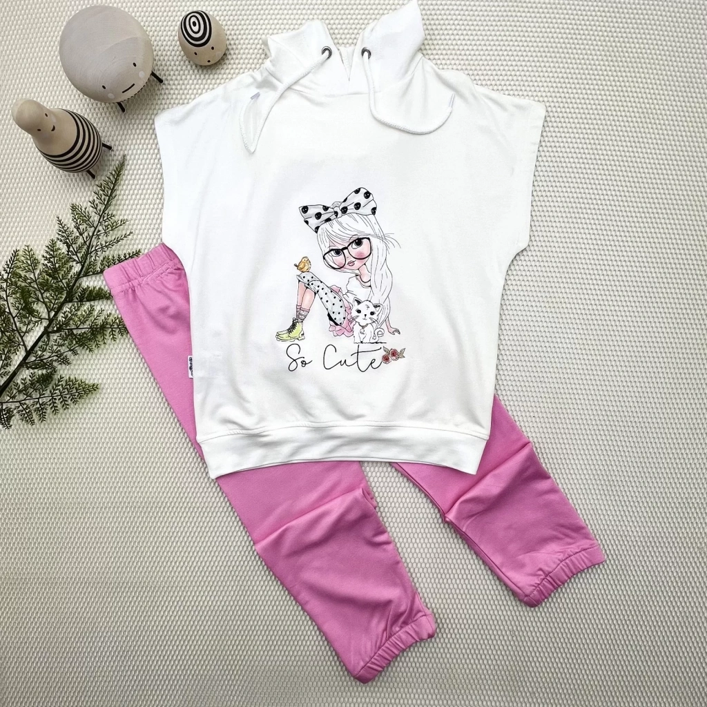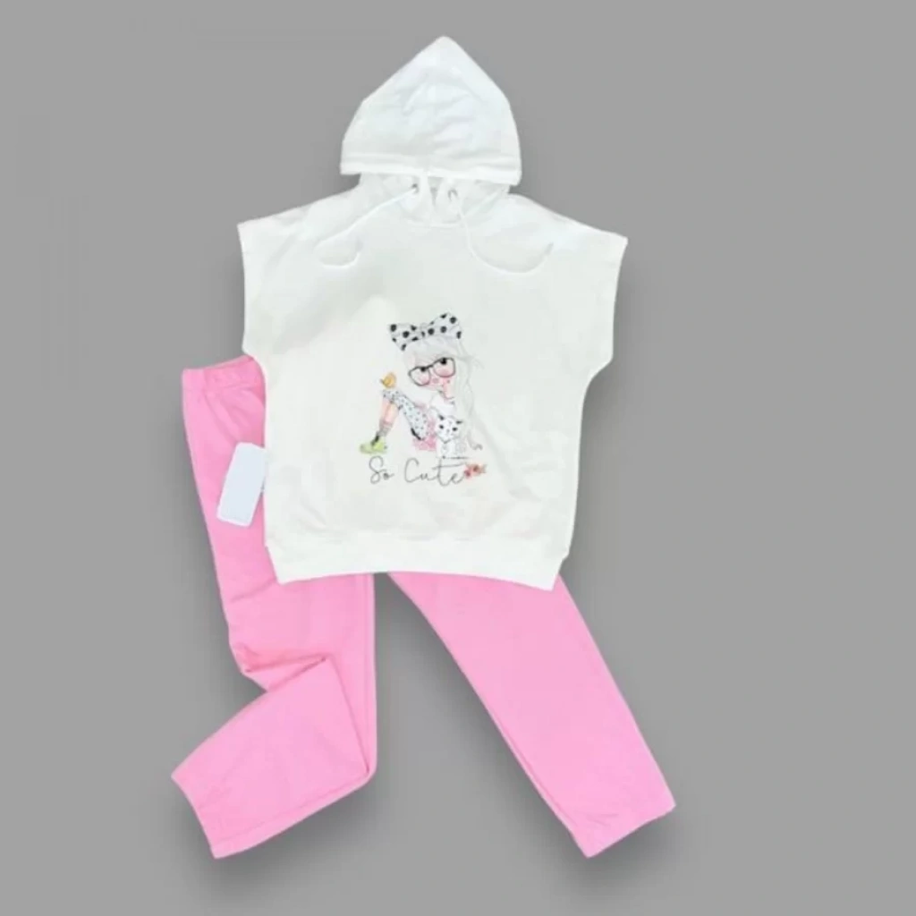 3-4-5 Yaş Kapşonlu Sevimli Kız Baskılı Kısa Kolu 2li Kız Erkek Çocuk Takımı Pembe