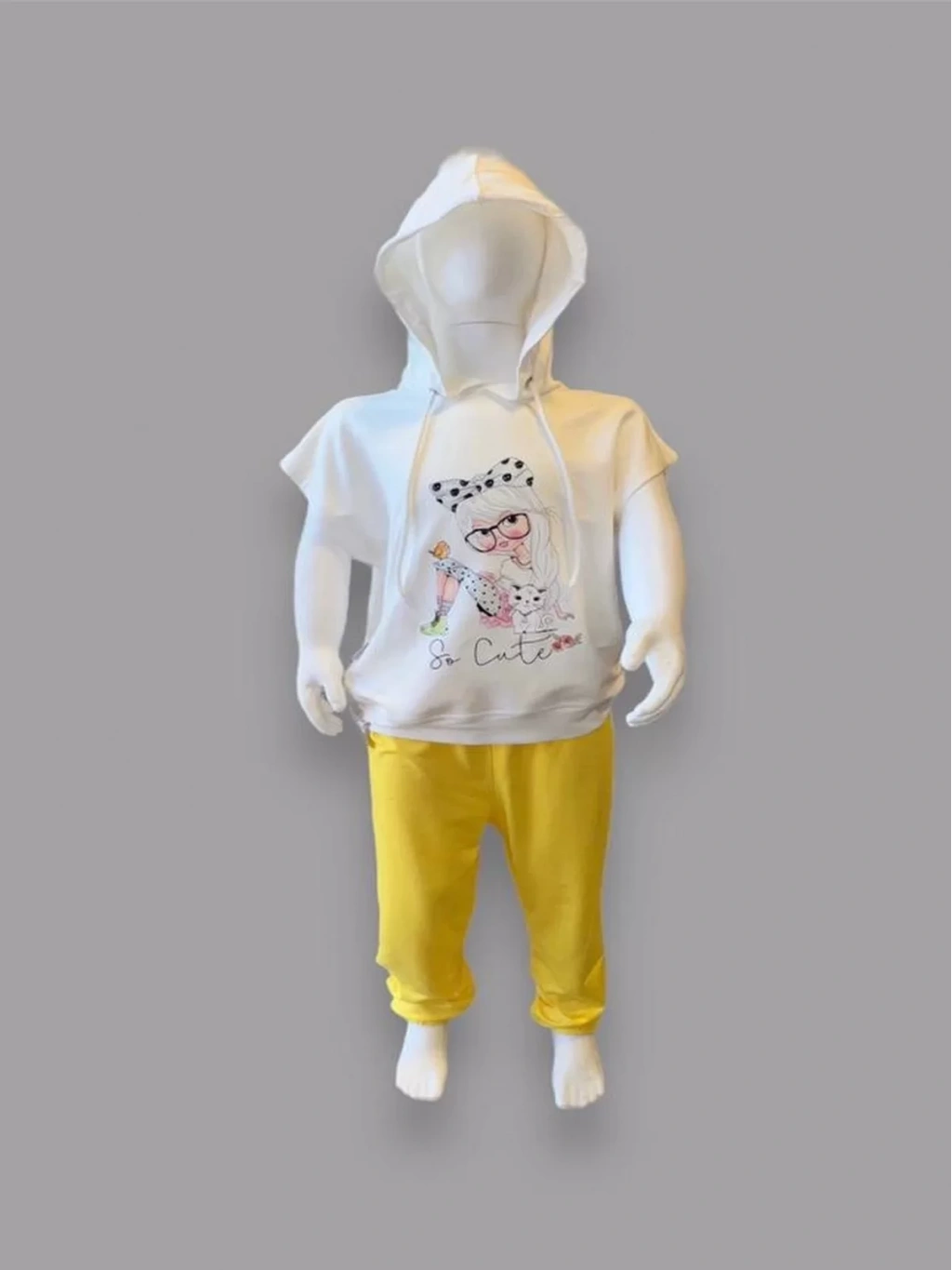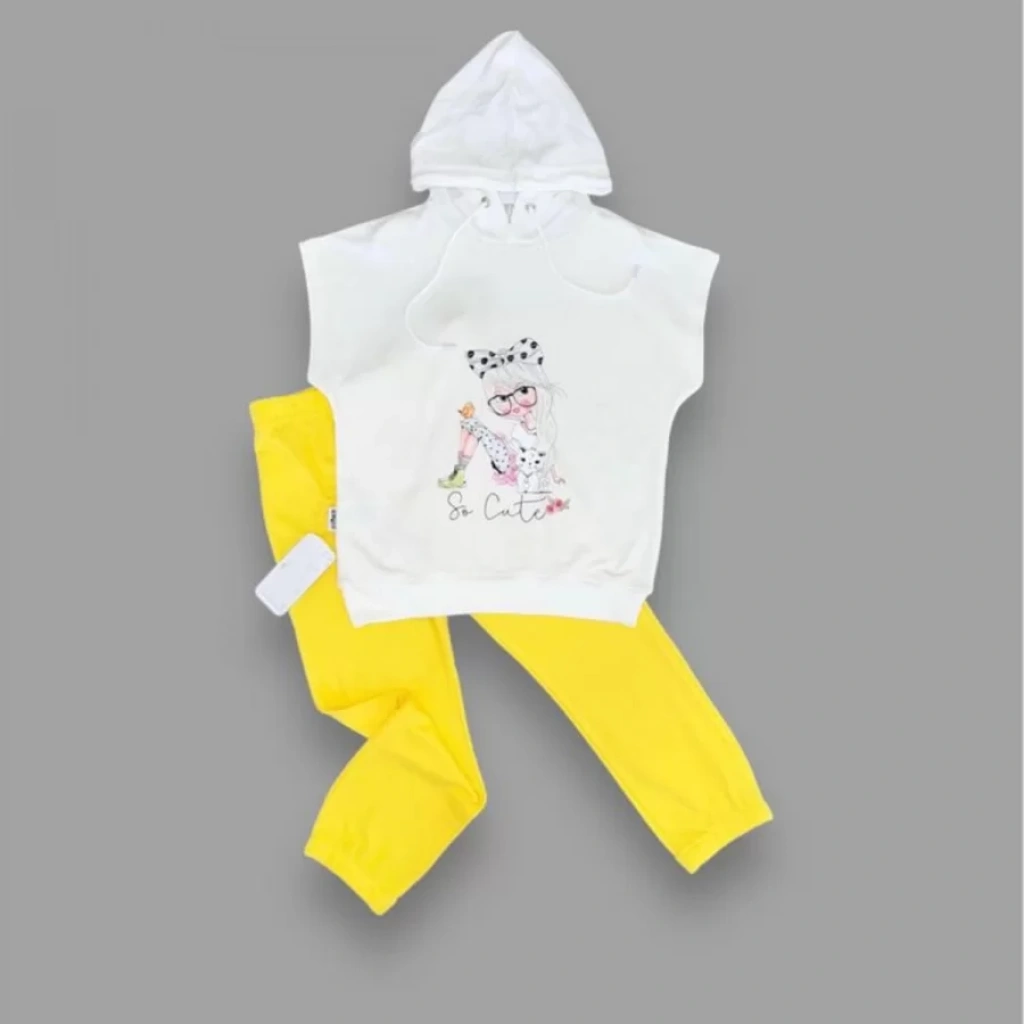 3-4-5 Yaş Kapşonlu Sevimli Kız Baskılı Kısa Kolu 2li Kız Erkek Çocuk Takımı Sarı
