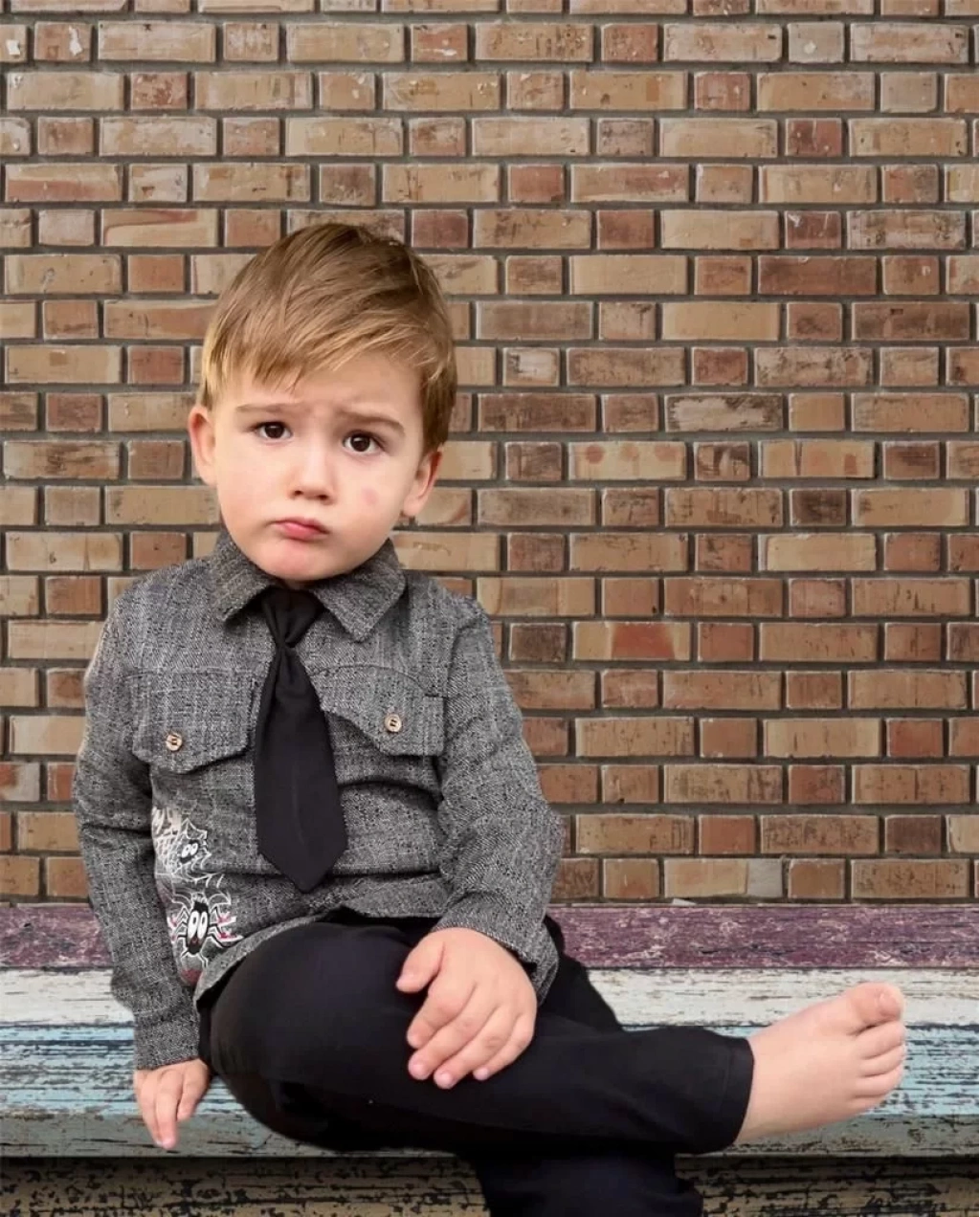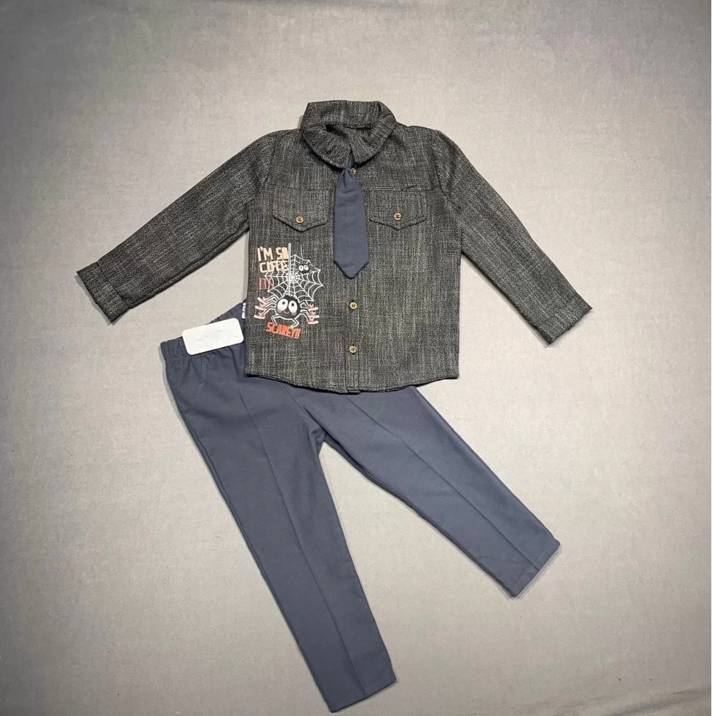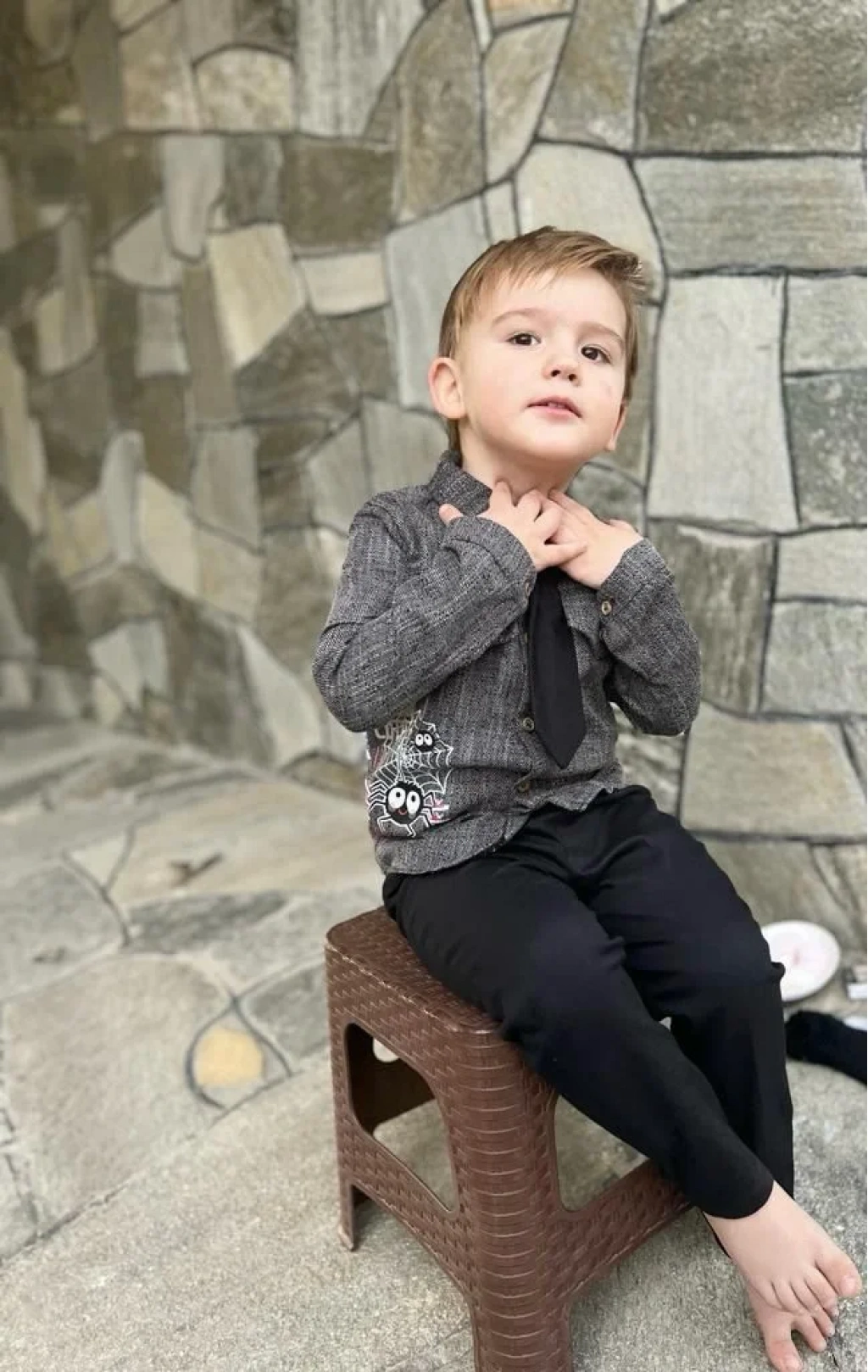 3-4-5 Yaş Kravatlı Keten Gömlek Gabardin Pantolon Uzun Kollu 3lü Erkek Çocuk Takımı Füme