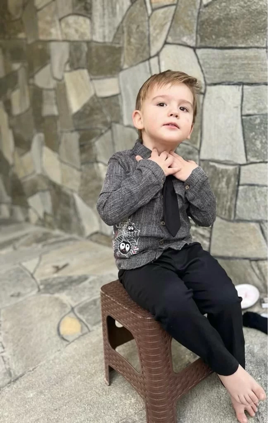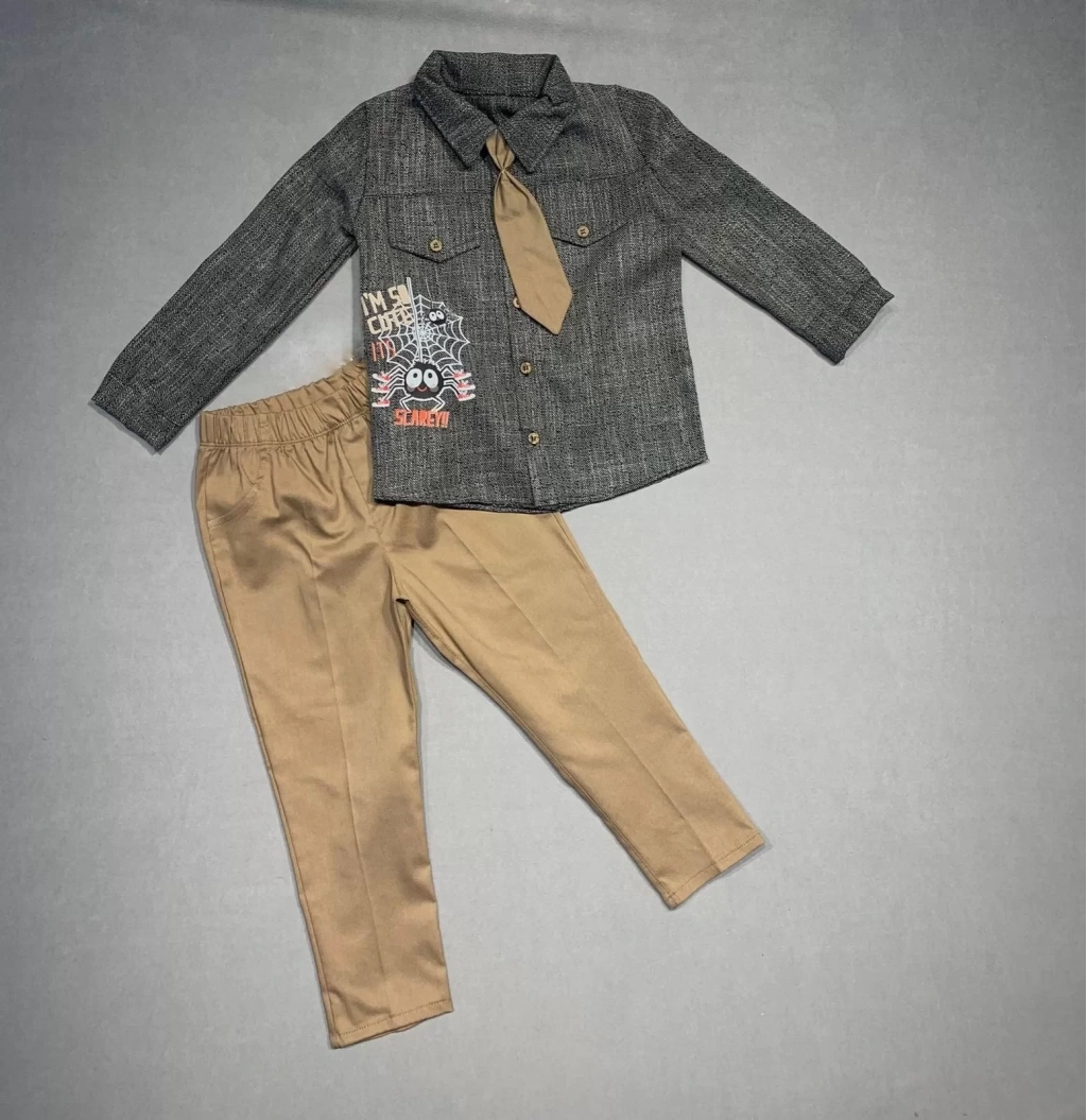 3-4-5 Yaş Kravatlı Keten Gömlek Gabardin Pantolon Uzun Kollu 3lü Erkek Çocuk Takımı Kahverengi