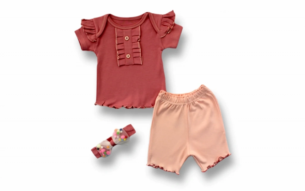 3-6 6-9 9-12 12-18 Ay Düğme Detaylı Bandanalı Kısa Kollu Sweat 3lü Kız Bebek Takımı Gül Kurusu