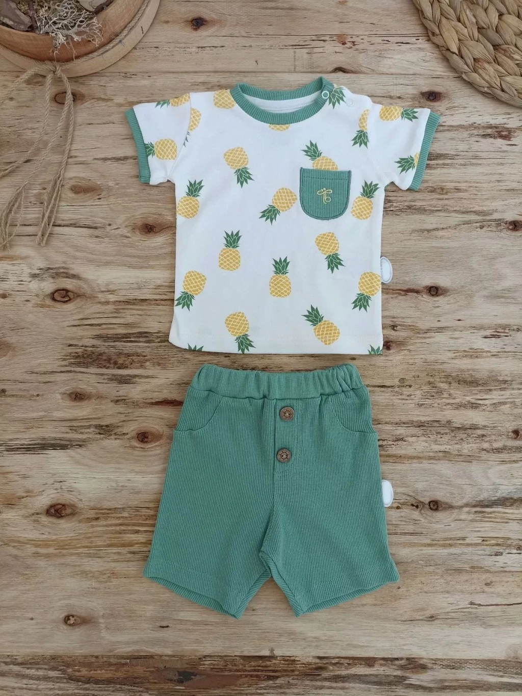3-6 6-9 9-12 Ay Ananas Baskılı Şort Tişört 2 Li Kız Erkek Bebek Takımı Yeşil