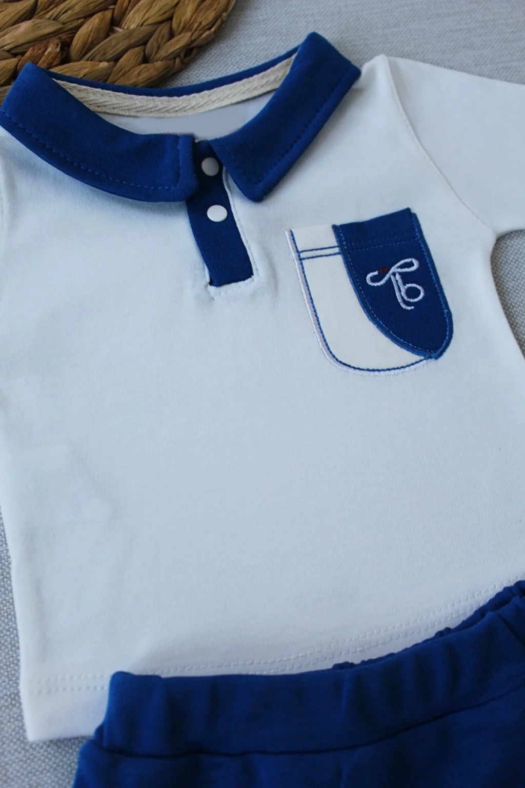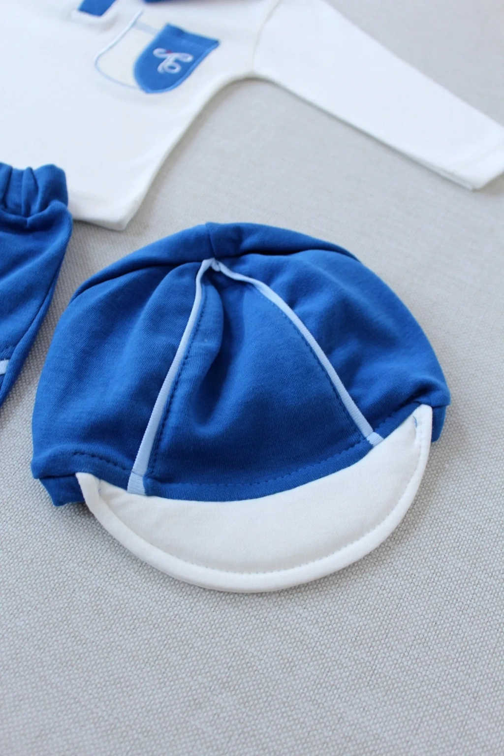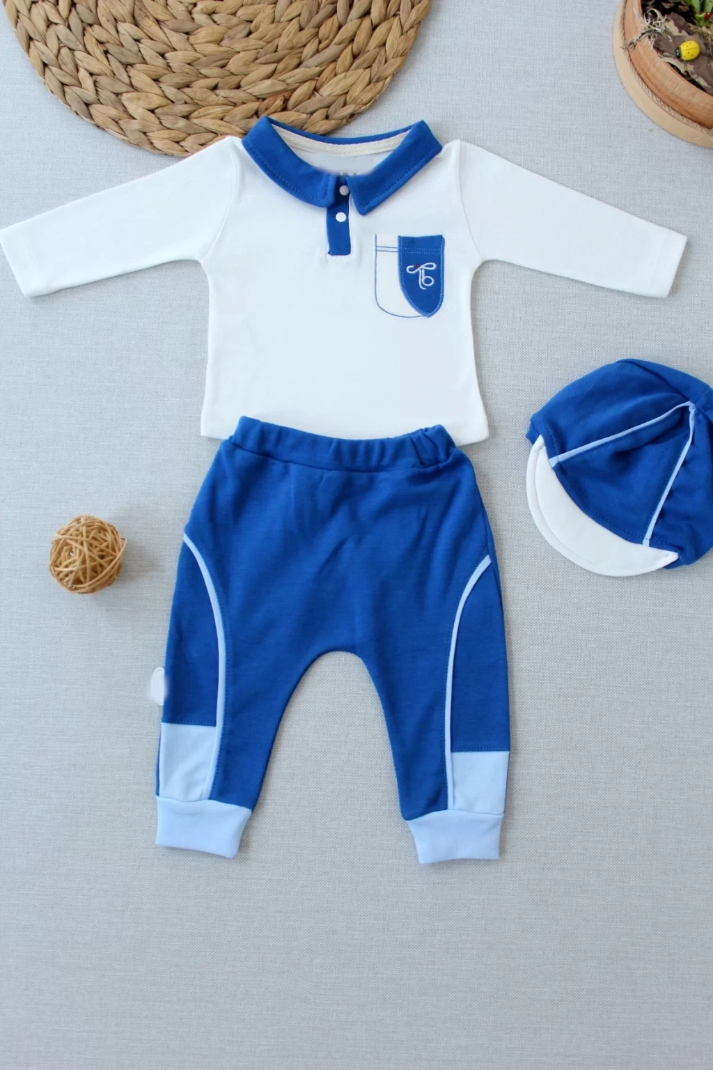 3-6 6-9 9-12 Ay Efendi Nakışlı Cep Şapkalı Uzun Kollu Sweat 3lü Erkek Bebek Takımı İndigo