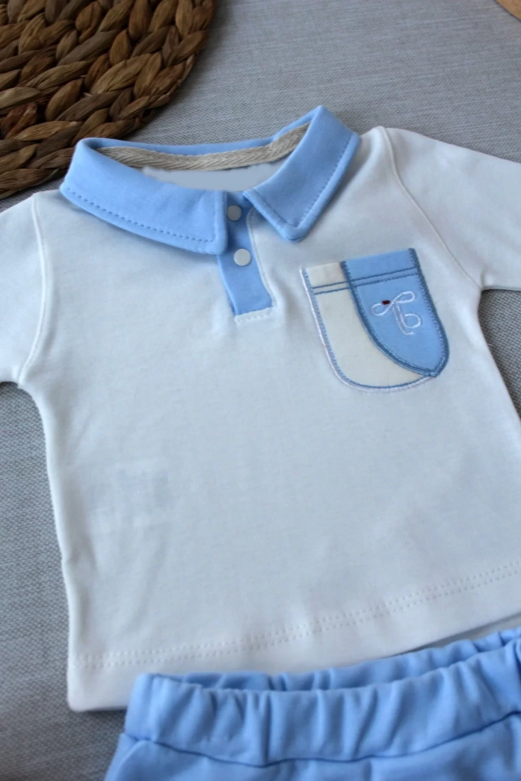 3-6 6-9 9-12 Ay Efendi Nakışlı Cep Şapkalı Uzun Kollu Sweat 3lü Erkek Bebek Takımı Mavi