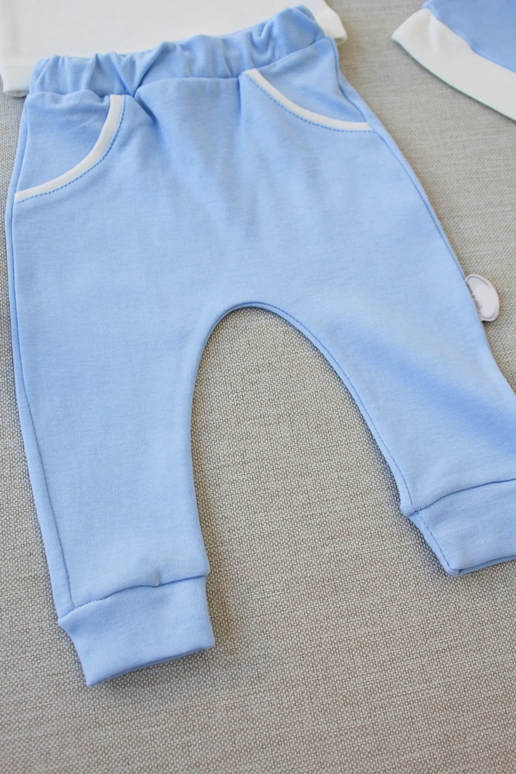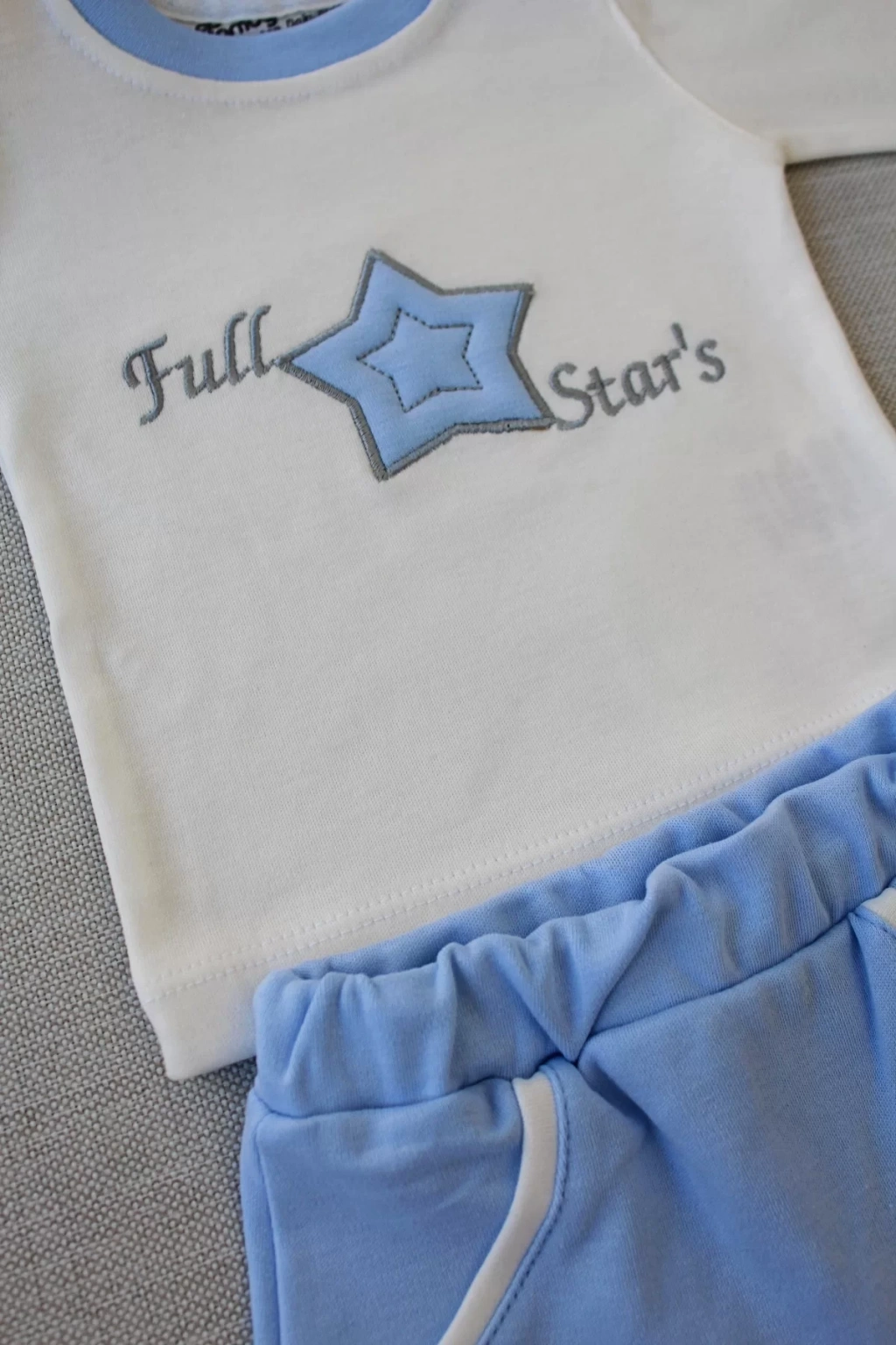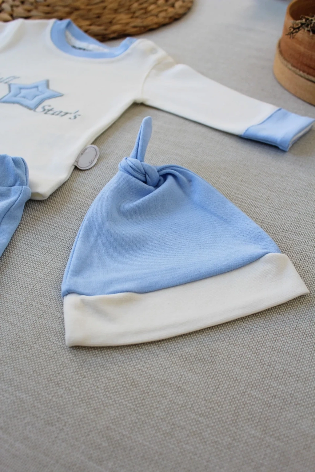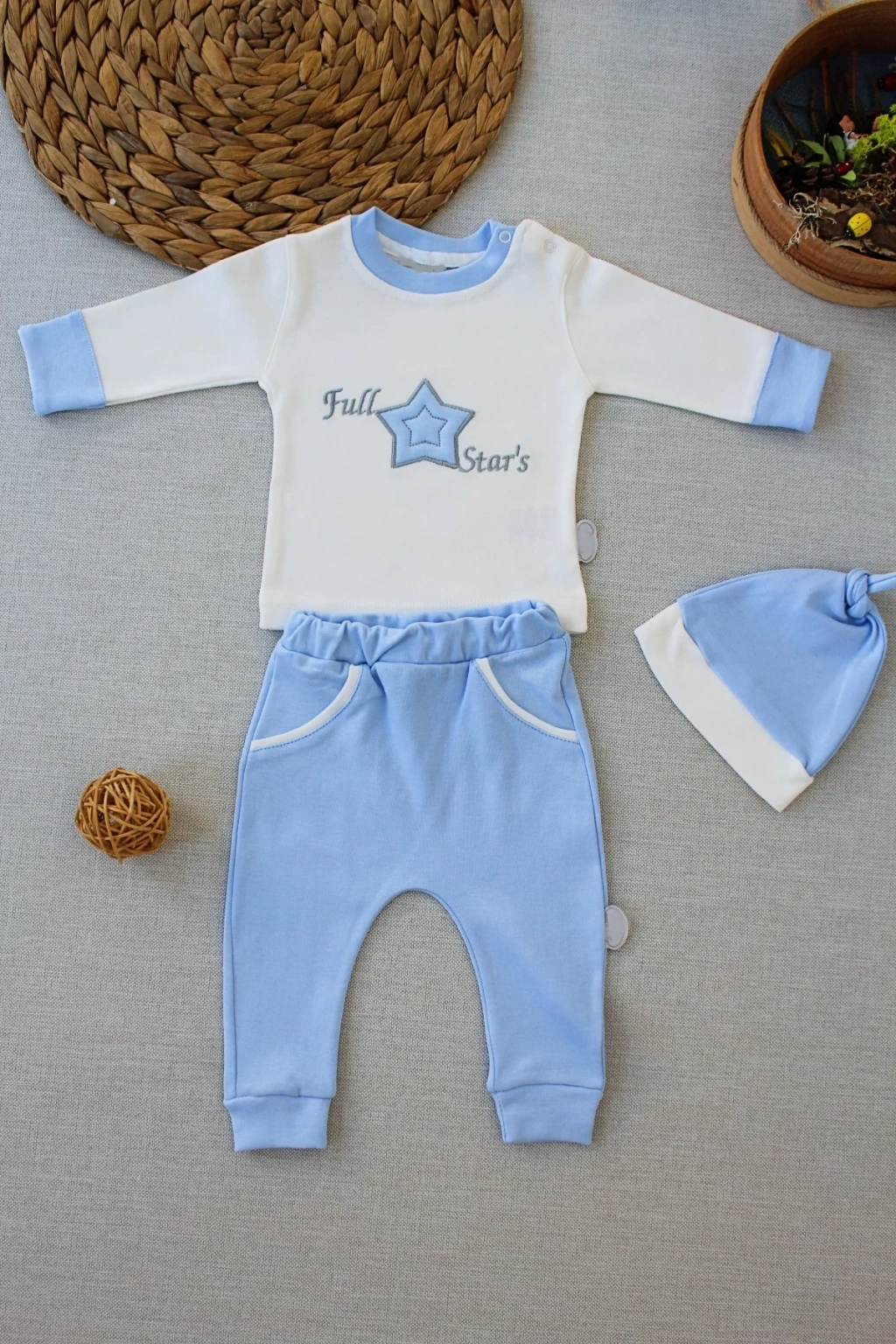 3-6 6-9 9-12 Ay Full Star Nakışlı Şapkalı Uzun Kollu Sweat 3lü Erkek Bebek Takımı Mavi