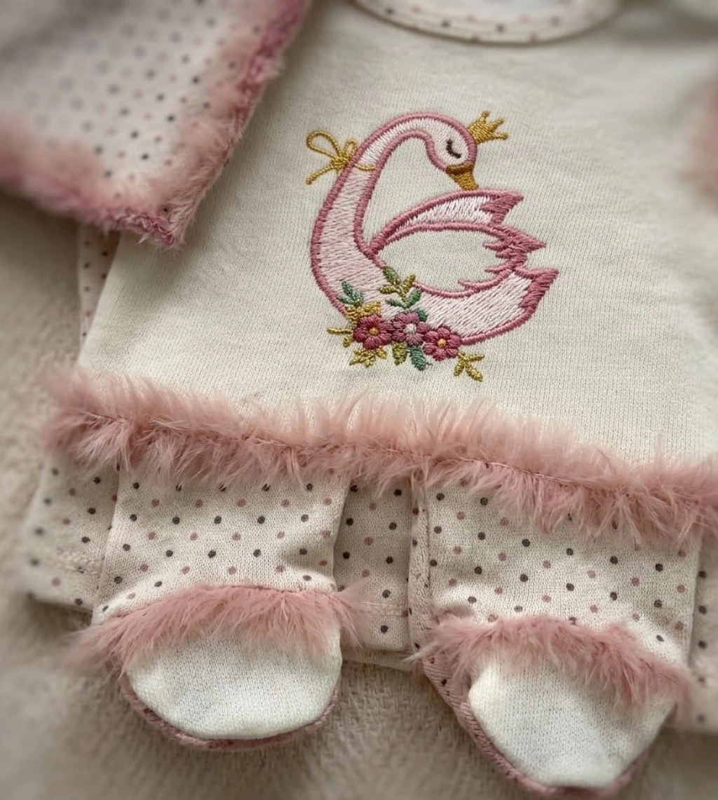 İleri Nakış Teknolojisi: Kraliçe kuğu figürü, yıkamalara karşı dayanıklı ve yüksek çözünürlüklü ileri nakış teknolojisi ile işlenmiştir.
