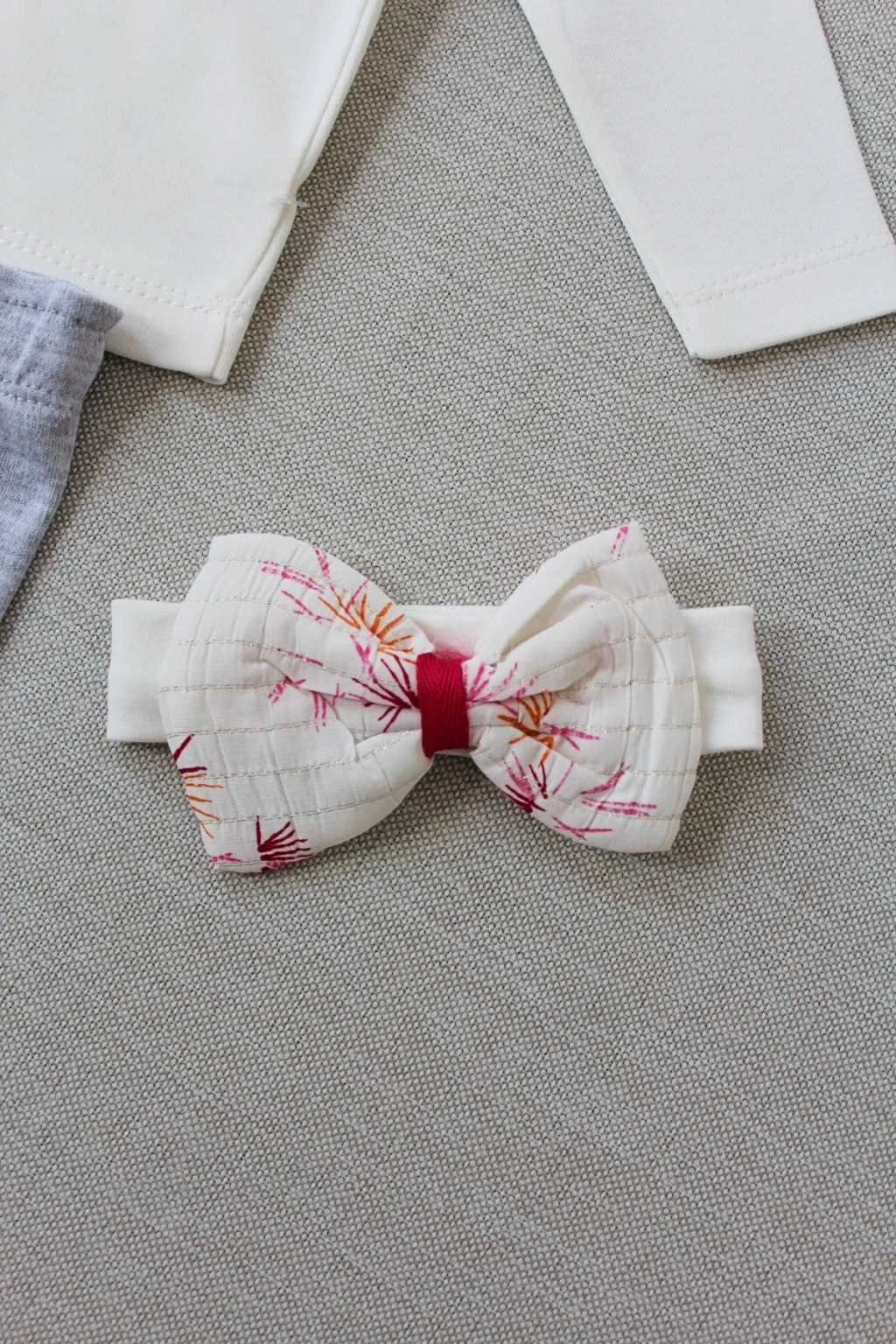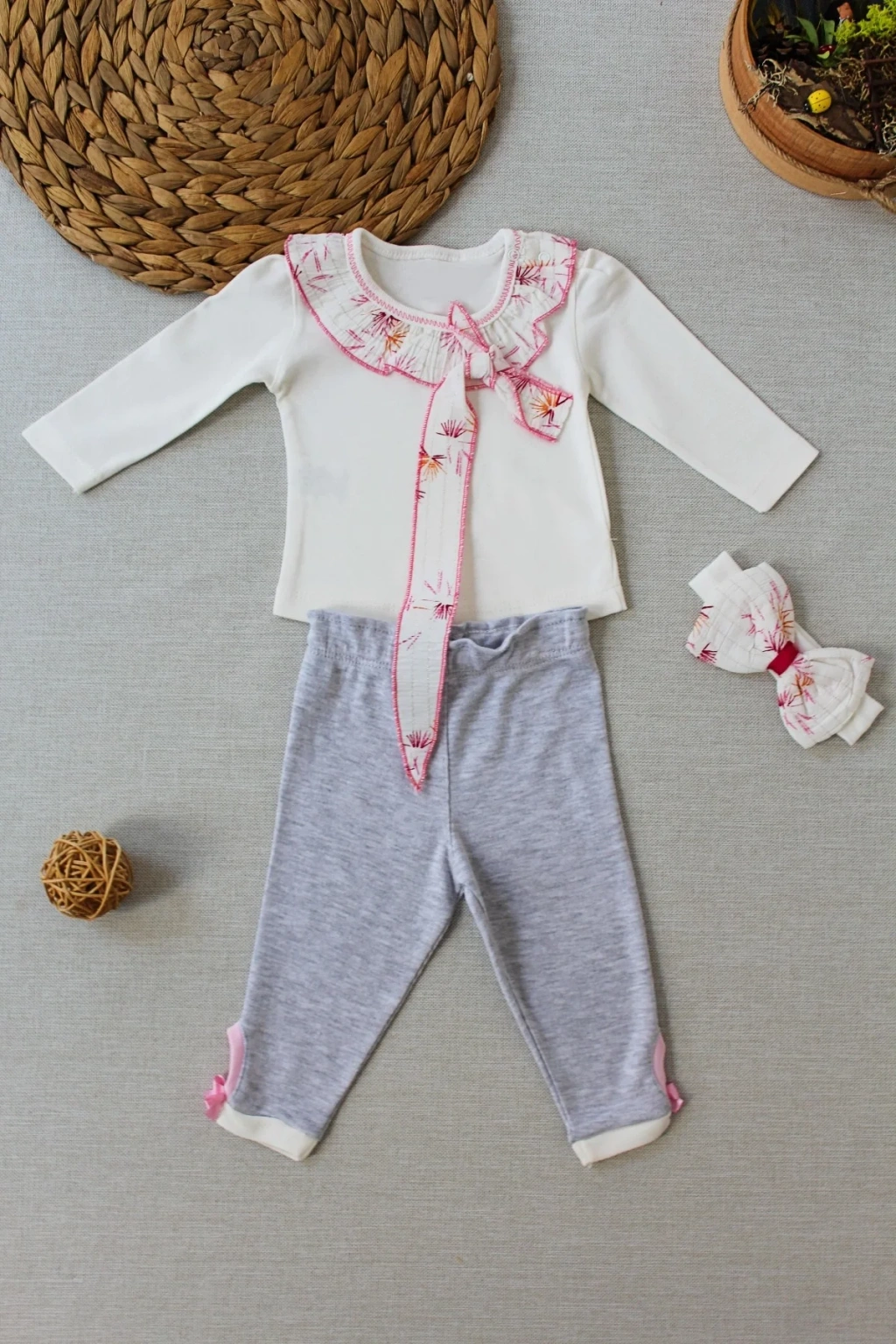3-6 6-9 9-12 Ay Matmazel Yaka Fırfır Detaylı Bandanalı Uzun Kollu Sweat 3lü Kız Bebek Takımı Ekru