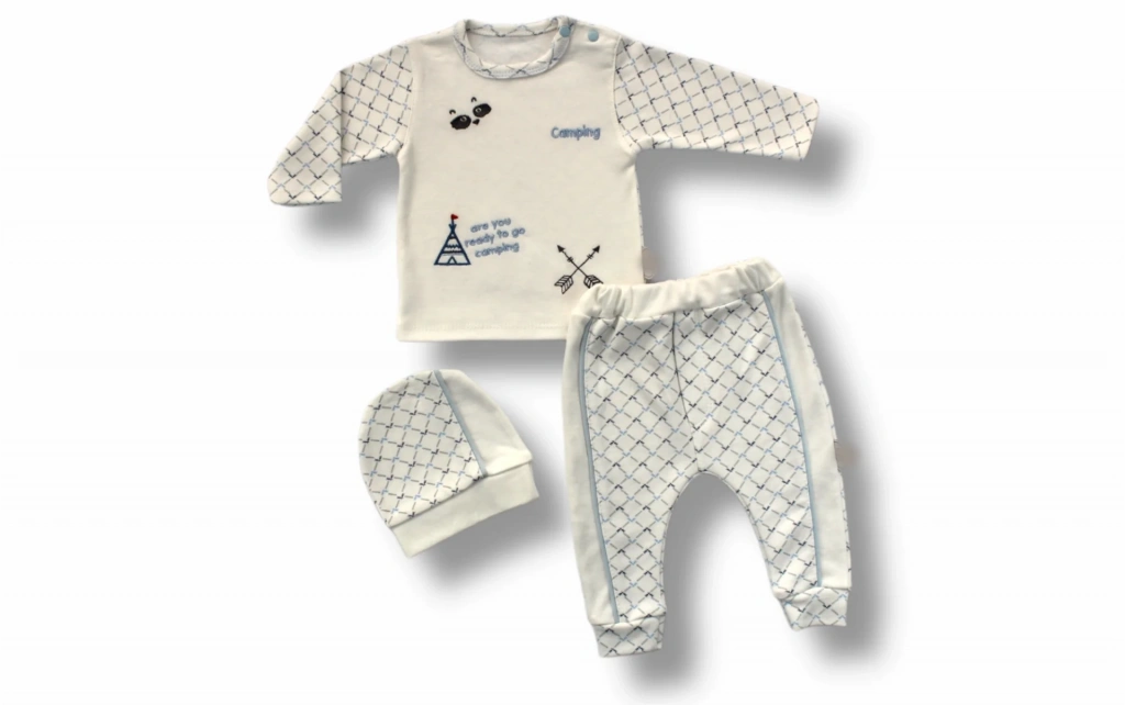 3-6 6-9 9-12 Ay My Camping Nakışlı Şapkalı Uzun Kollu Sweatli 3lü Erkek Bebek Takımı Ekru