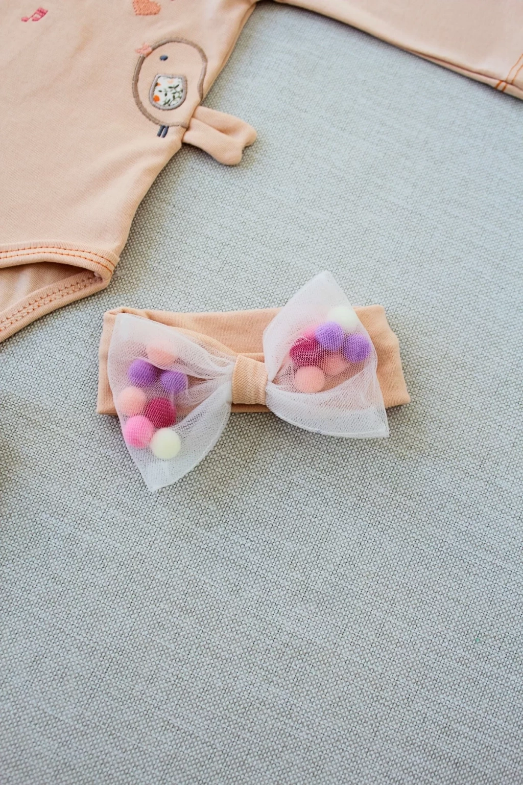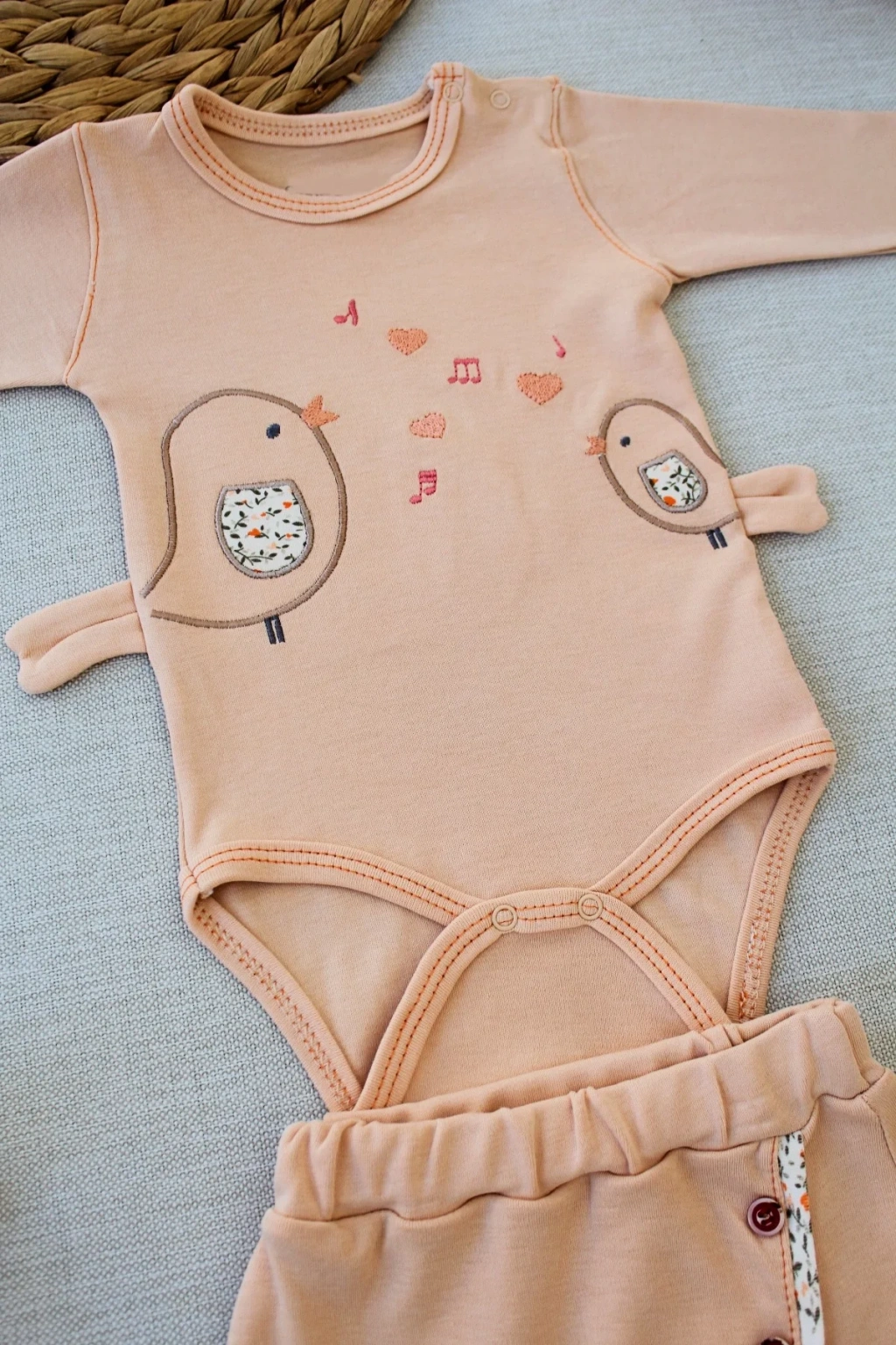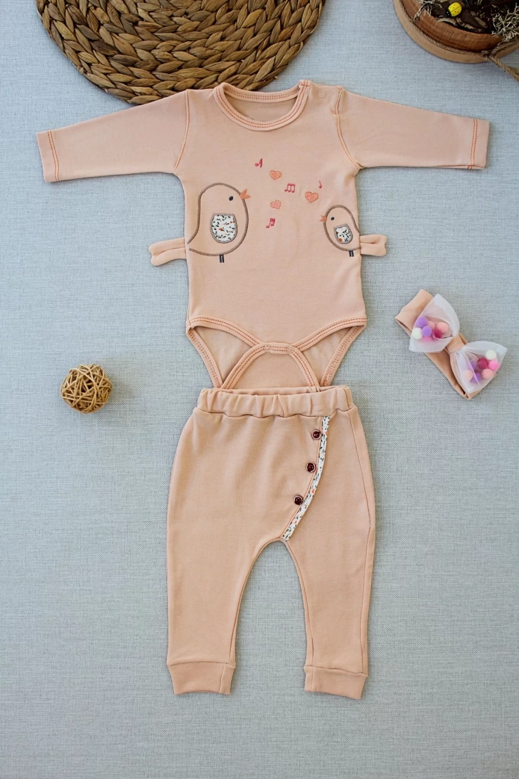 3-6 6-9 9-12 Ay Şarkıcı Kuşlar Nakışlı Bandanalı Uzun Kollu Zıbınlı 3lü Kız Bebek Takımı Buğday