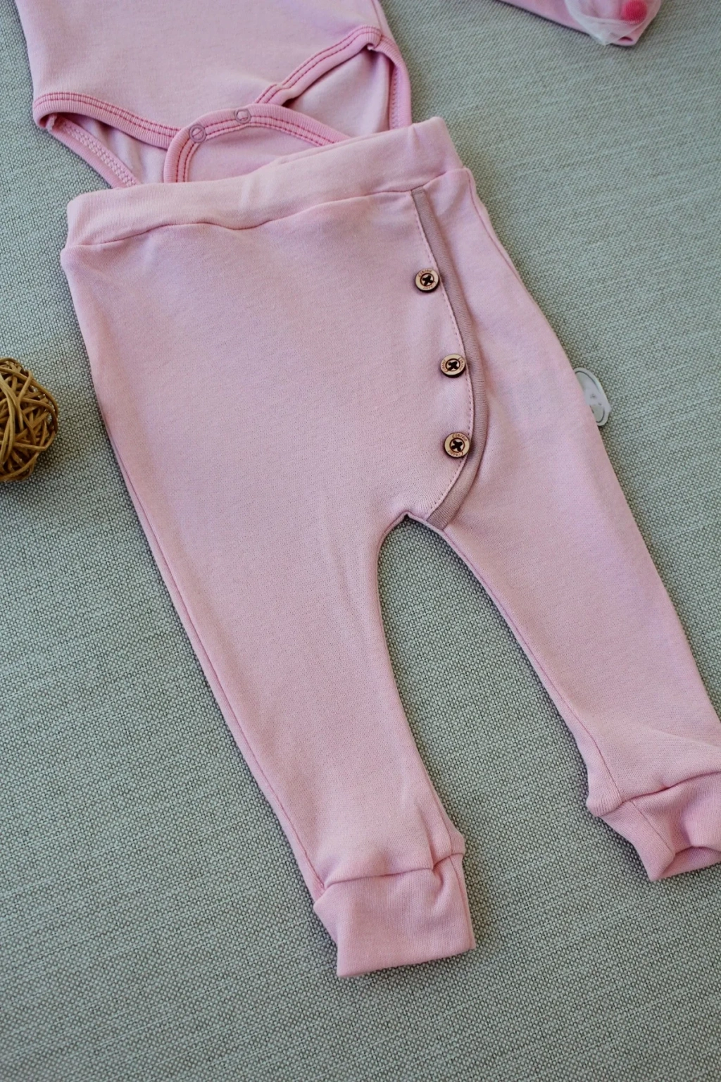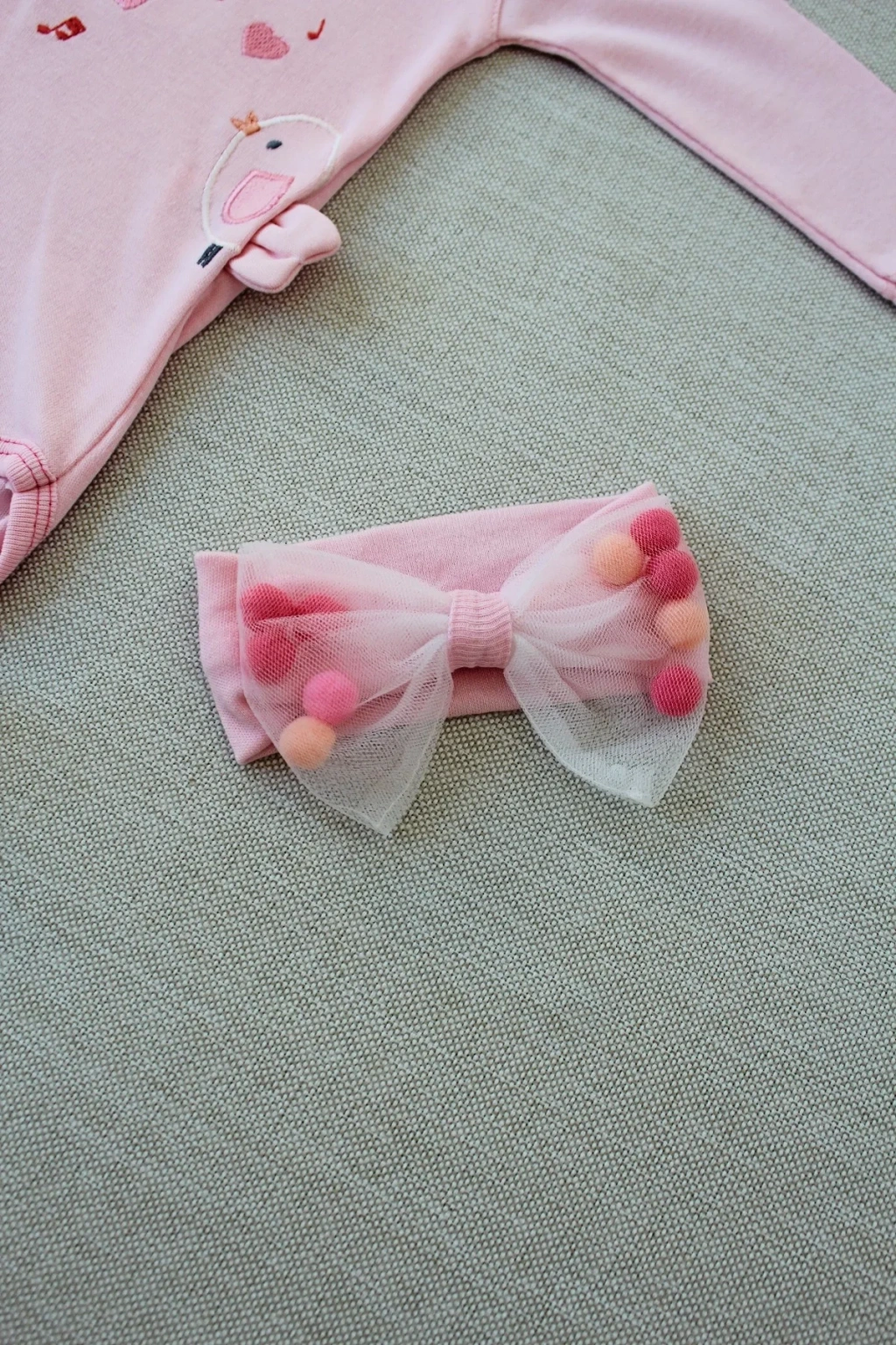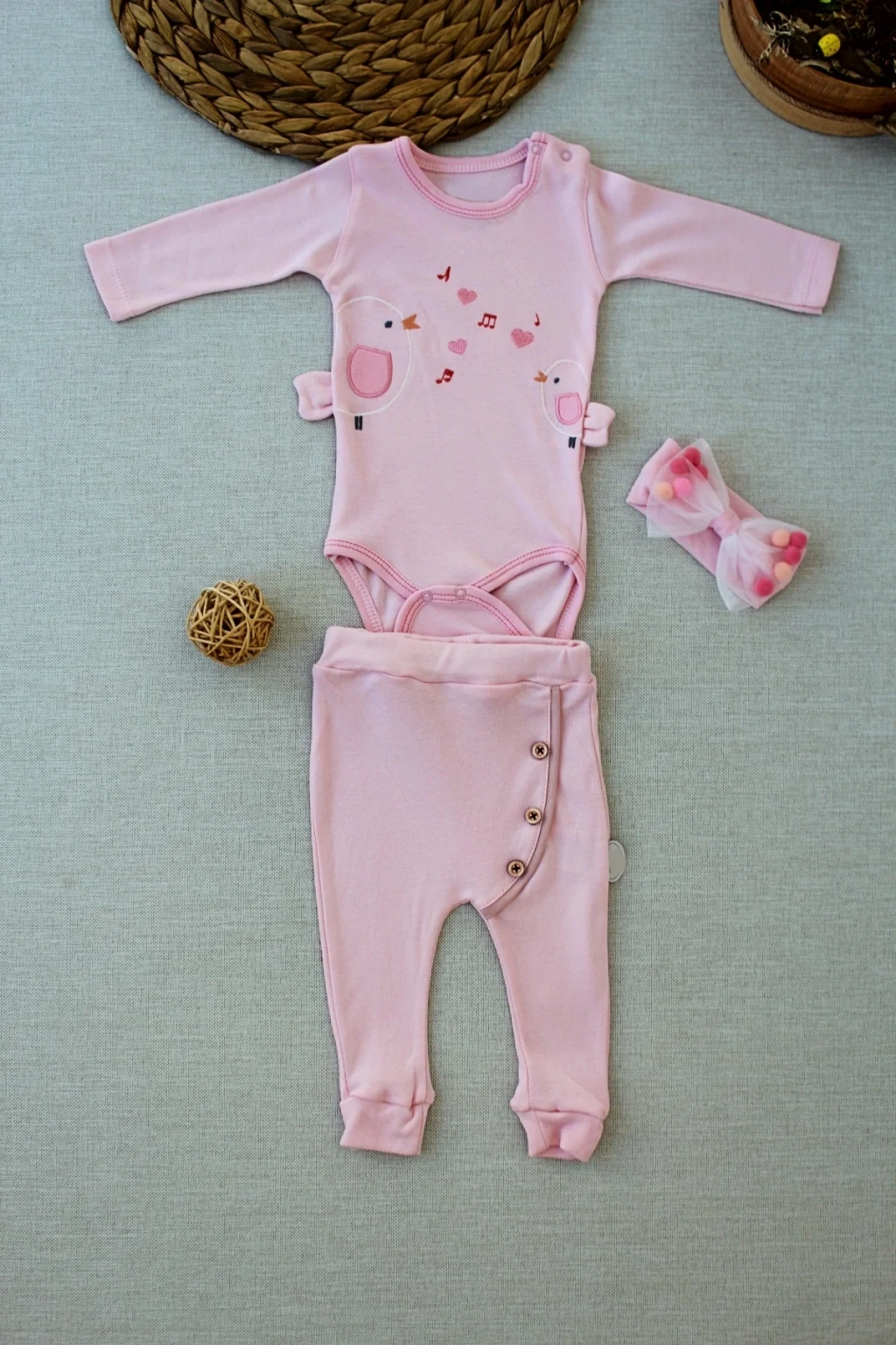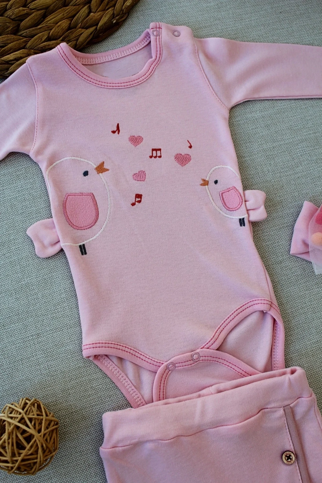 3-6 6-9 9-12 Ay Şarkıcı Kuşlar Nakışlı Bandanalı Uzun Kollu Zıbınlı 3lü Kız Bebek Takımı Pembe