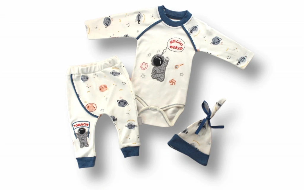 3-6 6-9 9-12 Ay Şirin Kozmonot Nakışlı Şapkalı Uzun Kollu Zıbınlı 3lü Kız-erkek Bebek Takımı Ekru