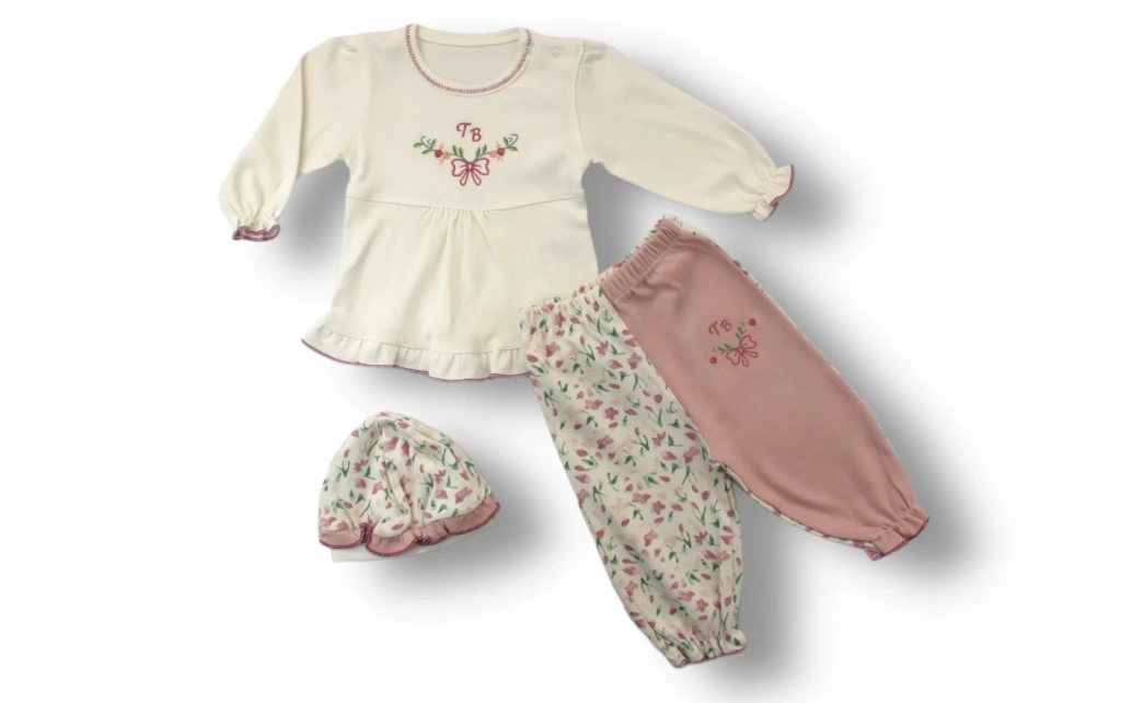 3-6 6-9 9-12 Ay Tb Çiçek Nakışlı Şapkalı Uzun Kollu Sweatli 3lü Kız Bebek Takımı Ekru