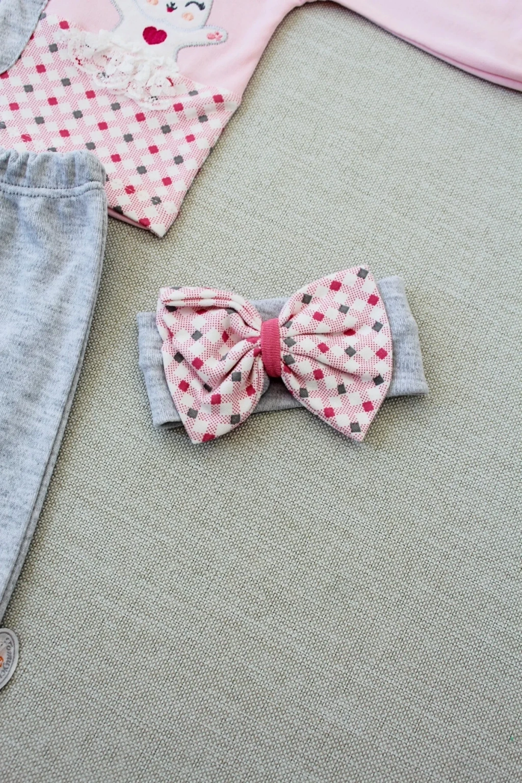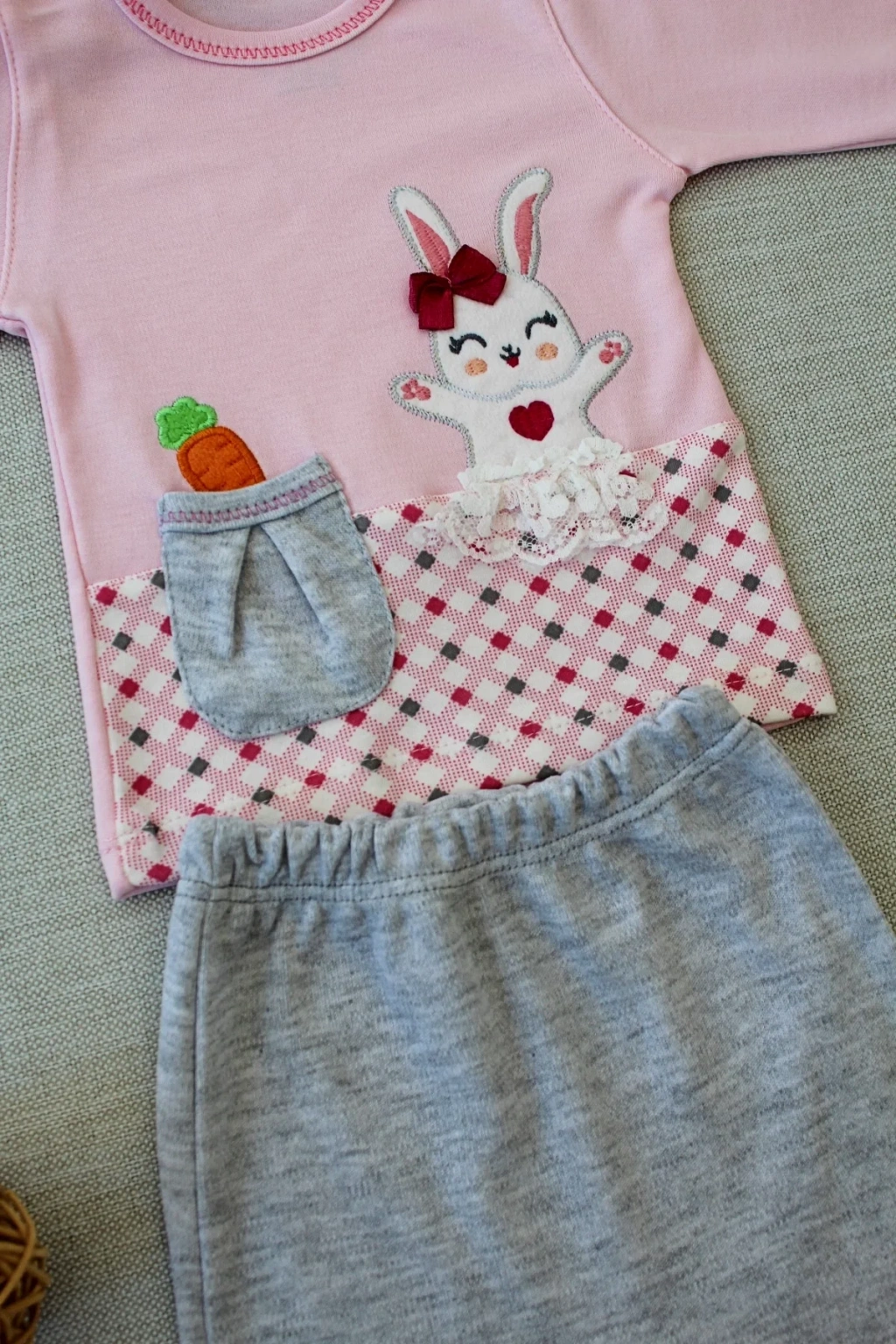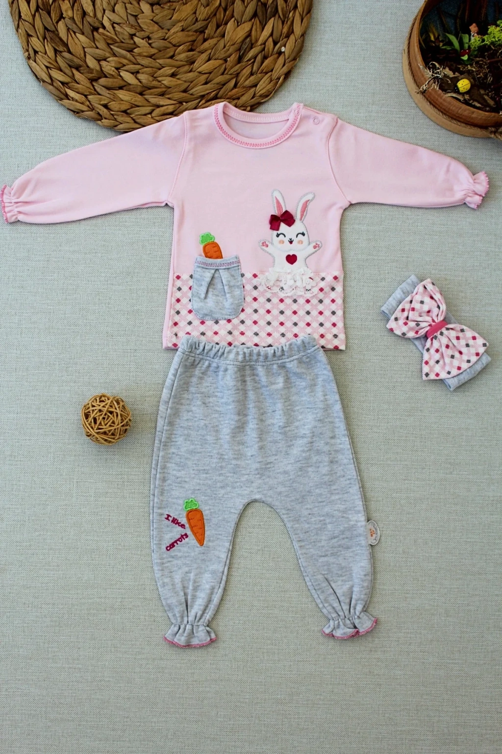 3-6 9-12 12-18 Ay Havuç Tavşan Nakışlı Bandanalı Cepli Uzun Kollu Sweatli 3lü Kız Bebek Tak Pembe