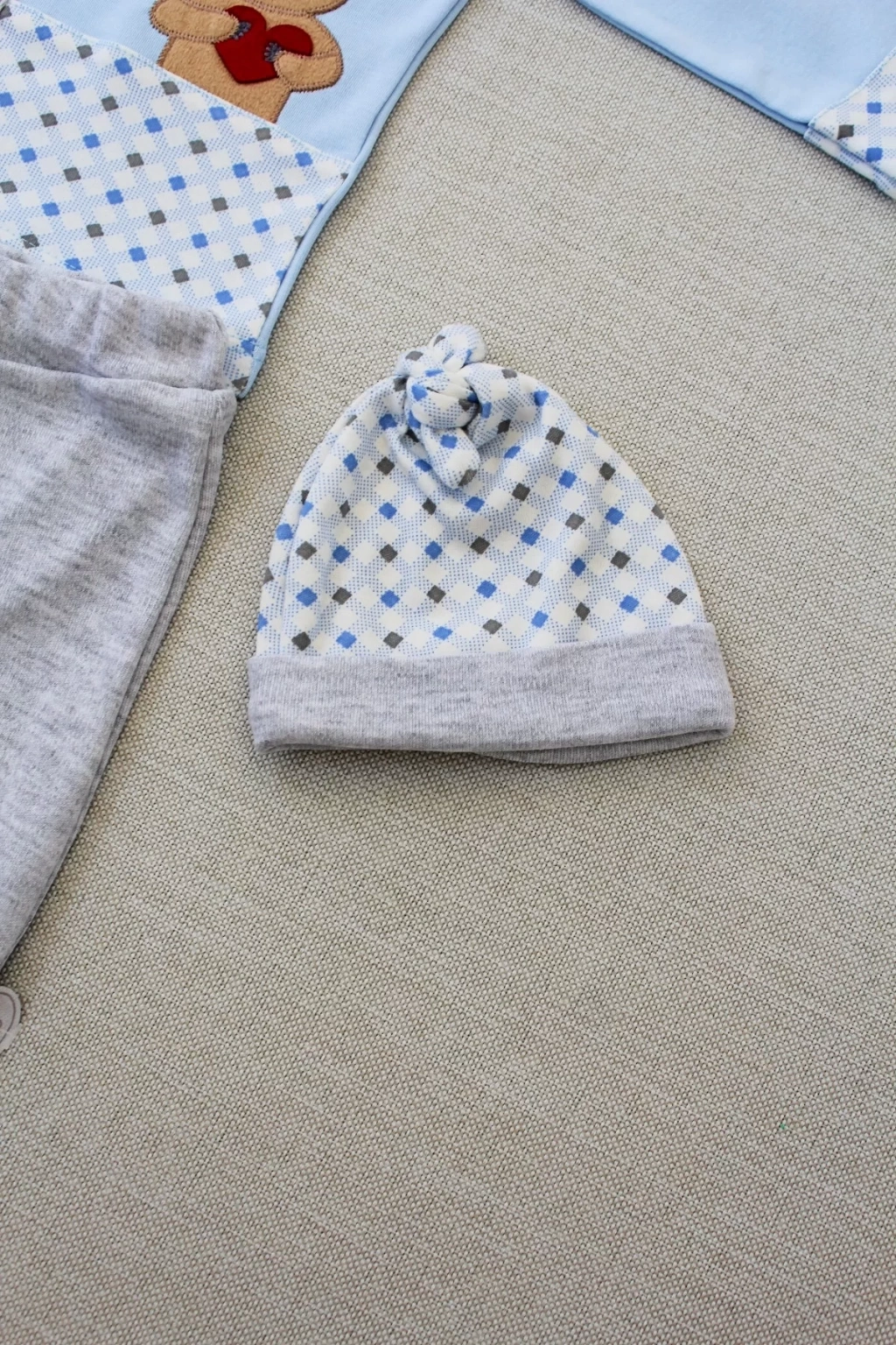 3-6 9-12 12-18 Ay Romantik Ayıcık Nakışlı Şapkalı Uzun Kollu Sweatli 3lü Kız-erkek Bebek Takımı Mavi