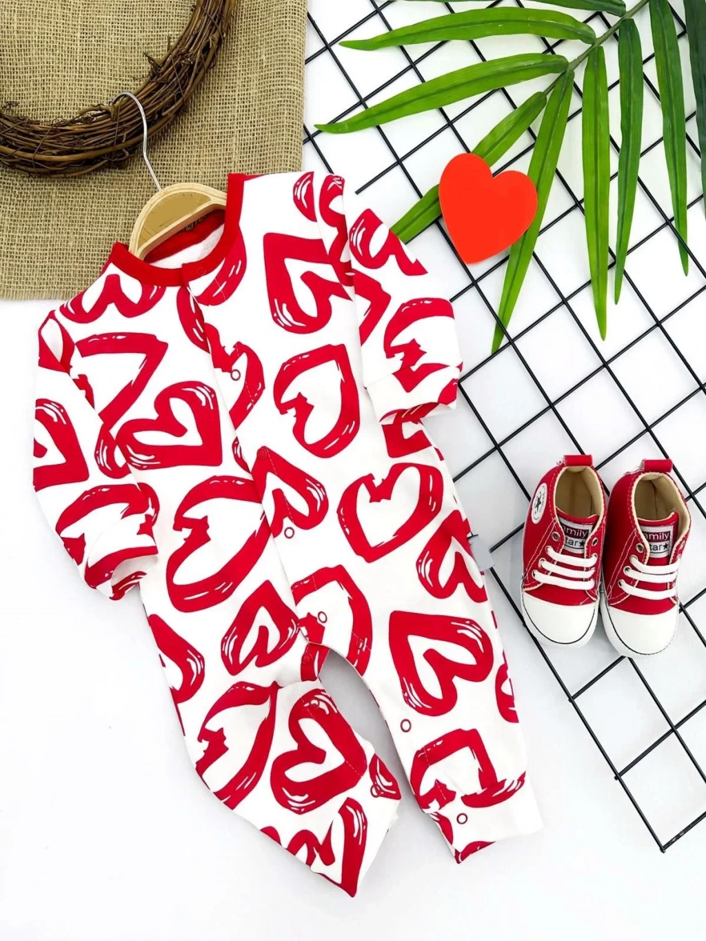 3-6-9-12 Ay Pastal Kalp Baskılı Uzun Kollu Kız Erkek Bebek Tulumu Kırmızı