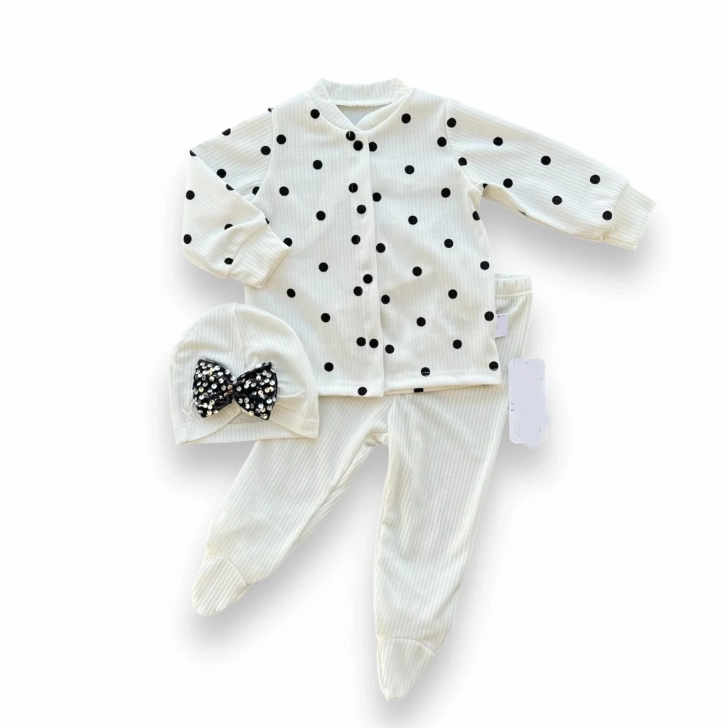 3-6-9-12 Ay Puantiyeli Şapkalı Çıtçıt Kapamalı Patikli 3lü Kız Bebek Takımı Beyaz