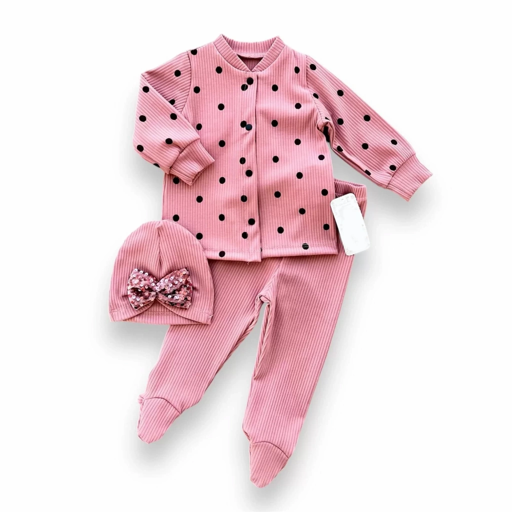 3-6-9-12 Ay Puantiyeli Şapkalı Çıtçıt Kapamalı Patikli 3lü Kız Bebek Takımı Gül Kurusu