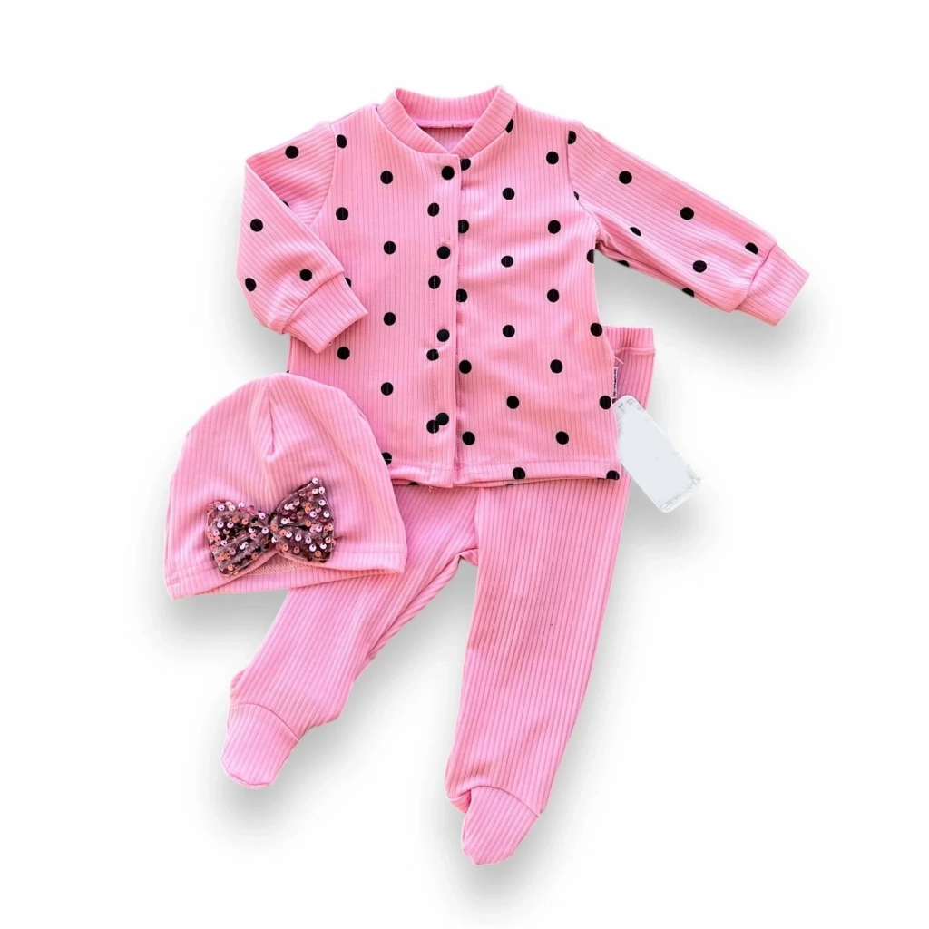 3-6-9-12 Ay Puantiyeli Şapkalı Çıtçıt Kapamalı Patikli 3lü Kız Bebek Takımı Pembe