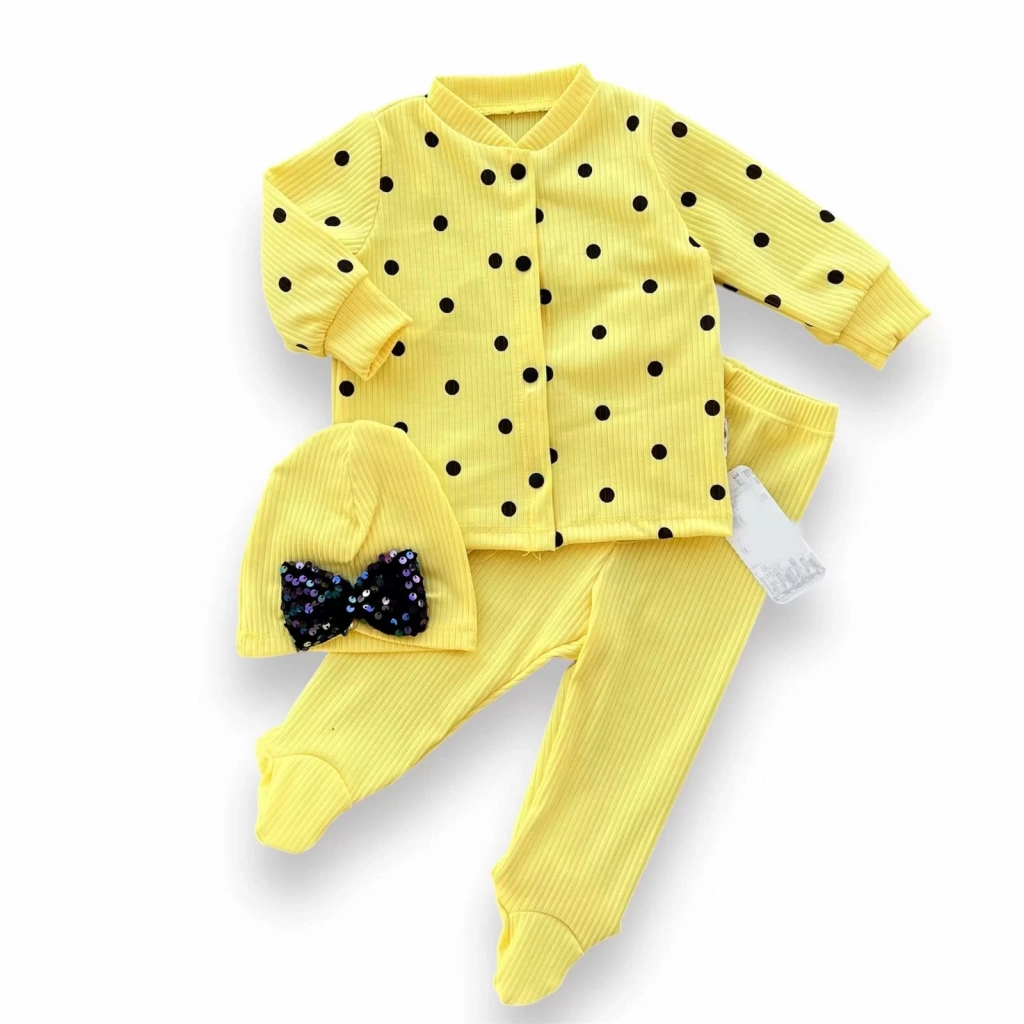 3-6-9-12 Ay Puantiyeli Şapkalı Çıtçıt Kapamalı Patikli 3lü Kız Bebek Takımı Sarı