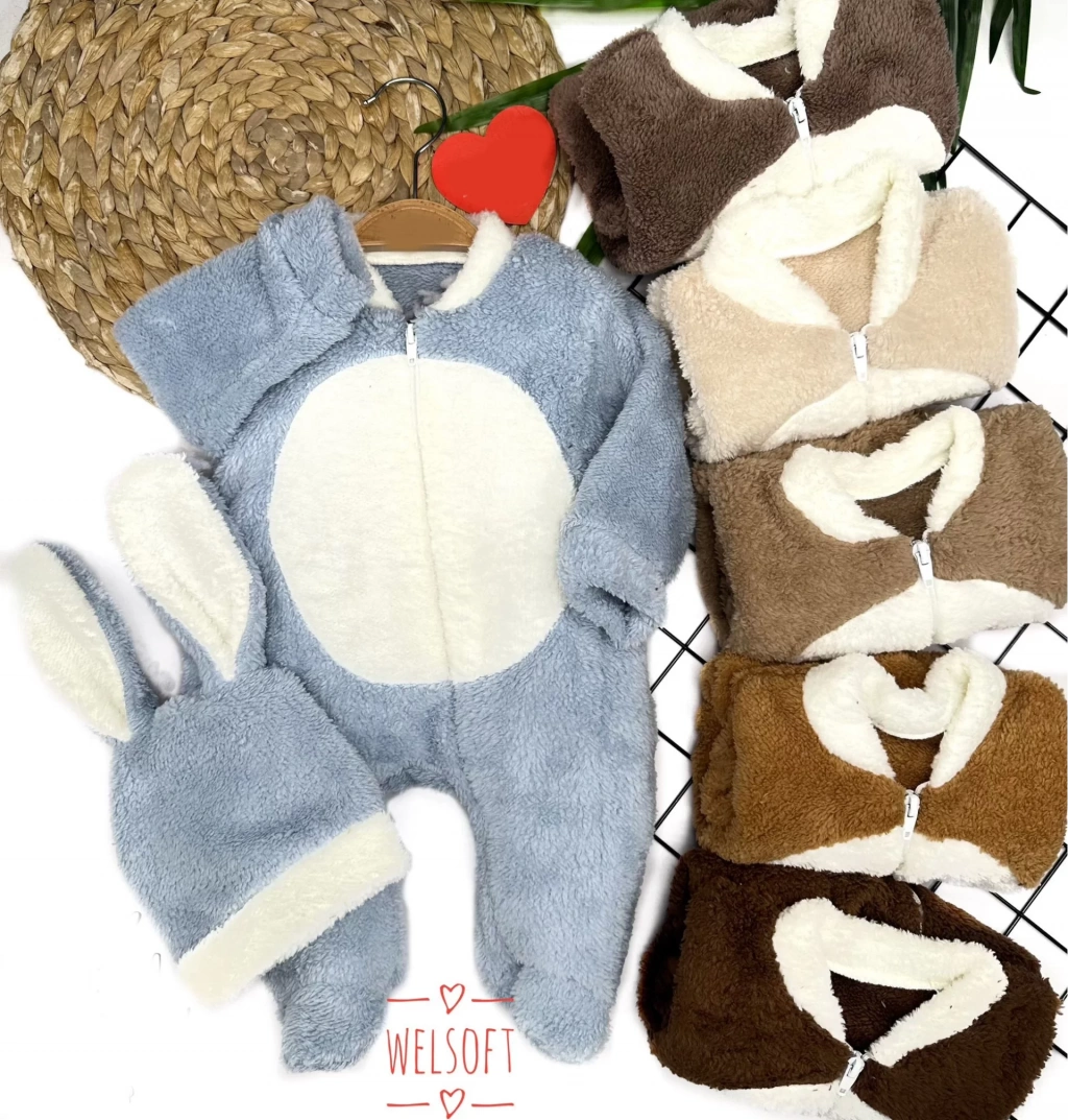3-6-9-12 Ay Tavşan Kulak Şapkalı Fermuar Kapamalı Patikli Eldivenli Tüylü Erkek Bebek Tulumu Kahverengi
