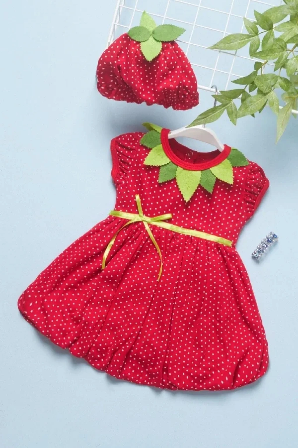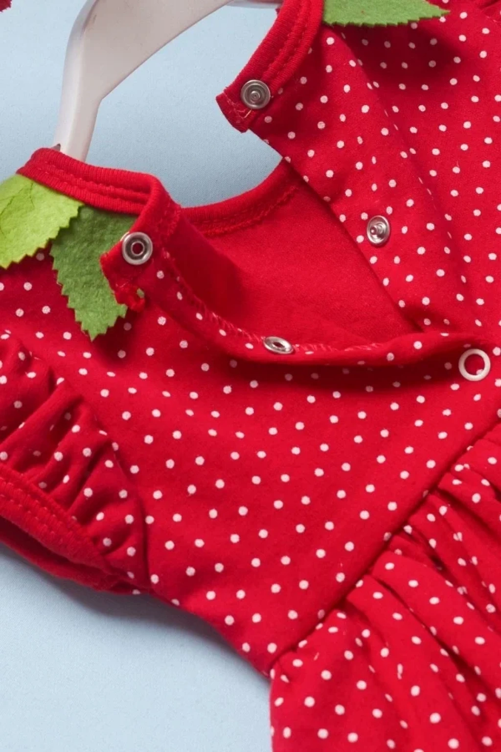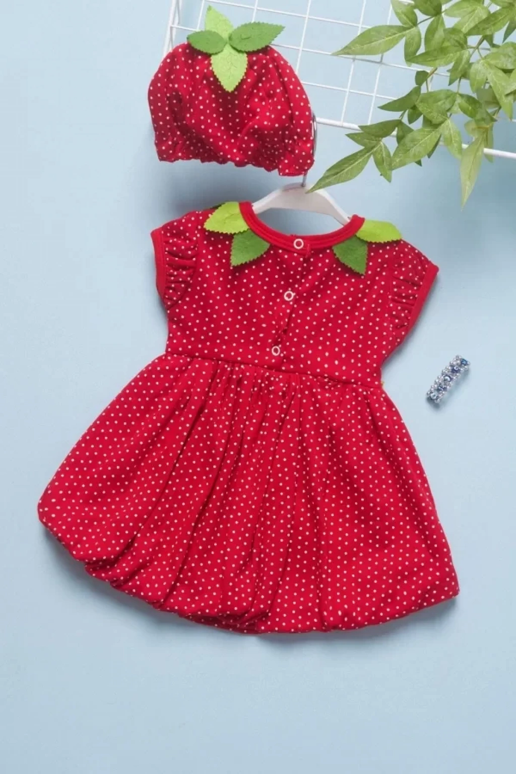 3-6-9 Ay Çilek Bebekler Penye Kumaş Kısa Kol Bebek Elbisesi Kırmızı