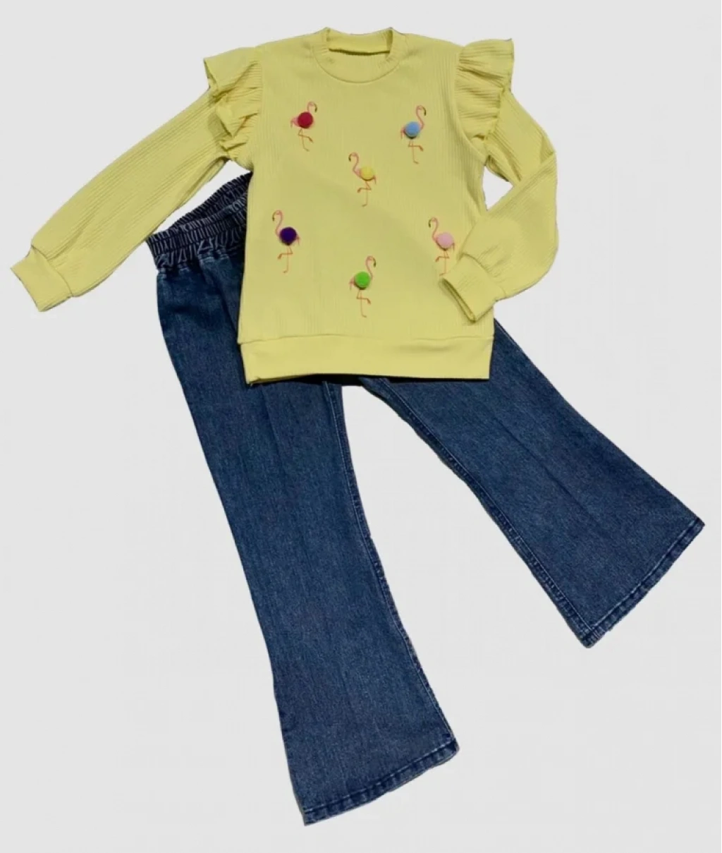 4-5-6 Yaş Kot Pantolonlu Flamingo Desenli Penye Sweat Uzun Kollu 2li Kız Çocuk Takımı Sarı