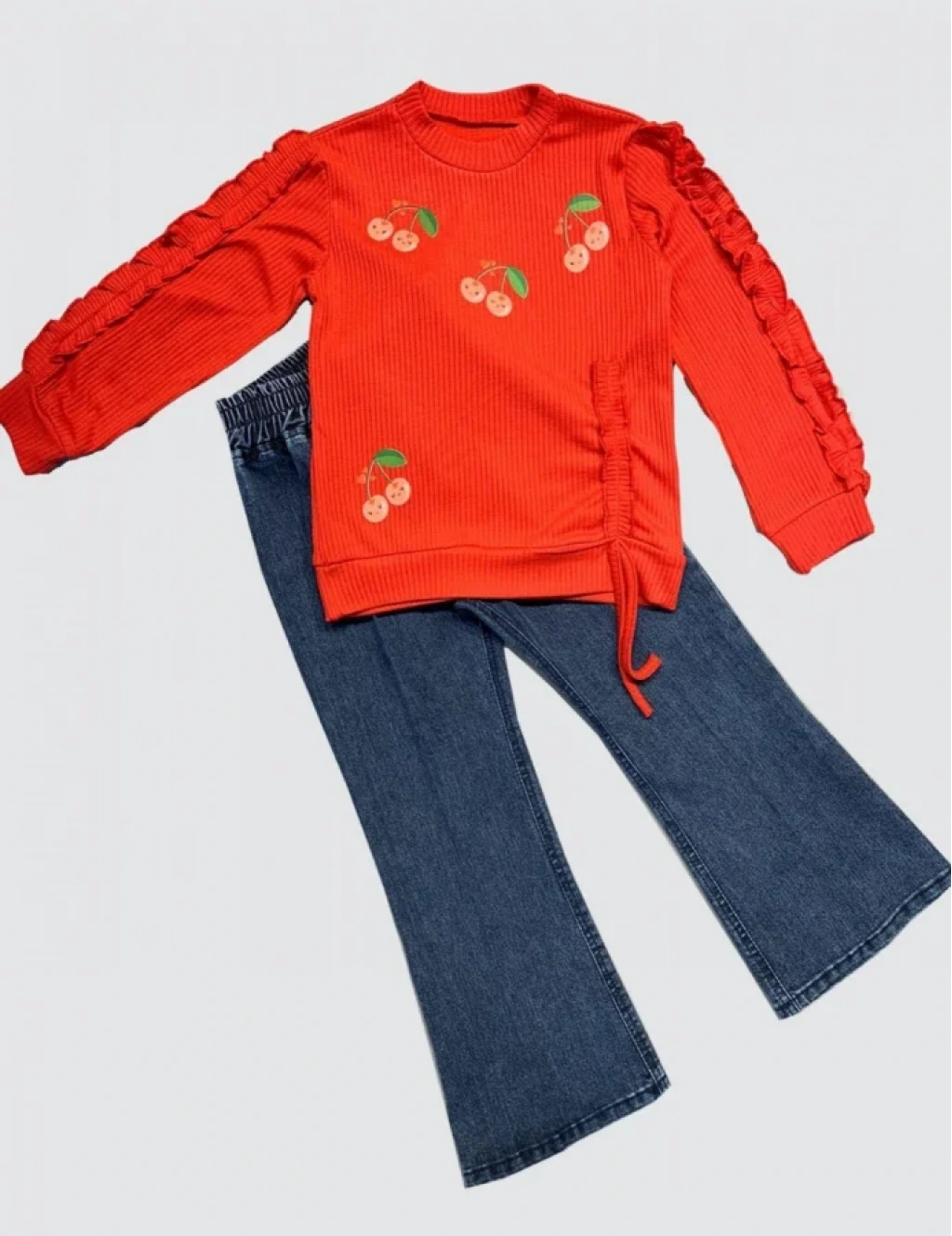 4-5-6 Yaş Kot Pantolonlu Kiraz Desenli Penye Sweat Uzun Kollu 2li Kız Çocuk Takımı Kırmızı
