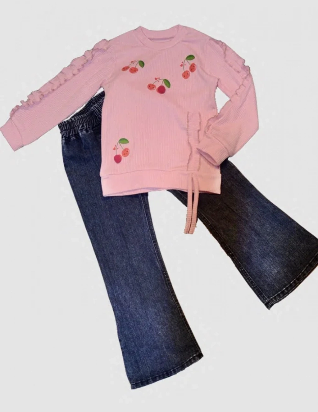 4-5-6 Yaş Kot Pantolonlu Kiraz Desenli Penye Sweat Uzun Kollu 2li Kız Çocuk Takımı Pembe