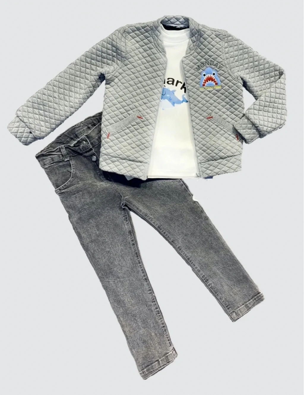 4-5-6 Yaş Kot Pantolonlu Pilot Mont Uzun Kollu Penye Sweat 3lü Erkek Çocuk Takımı Gri