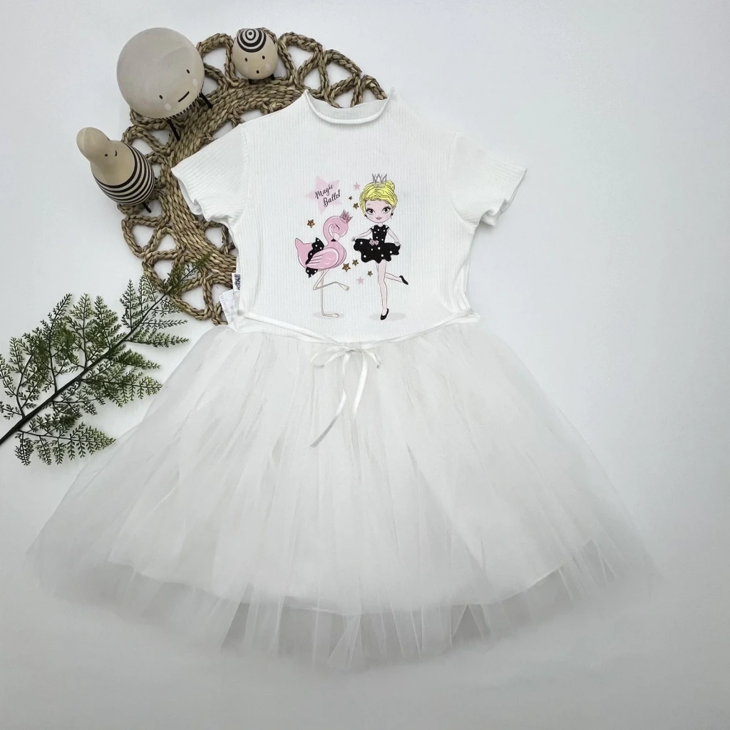 5-6-7 Yaş Flamingo Balerin Kız Baskılı Kurdela Kuşaklı Astarlı Kız Çocuk Tütü Elbise Beyaz