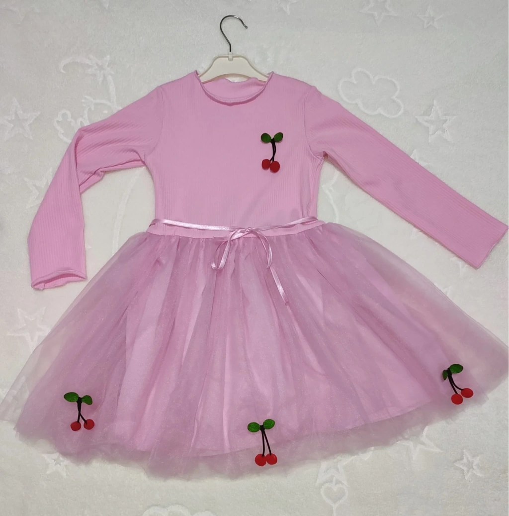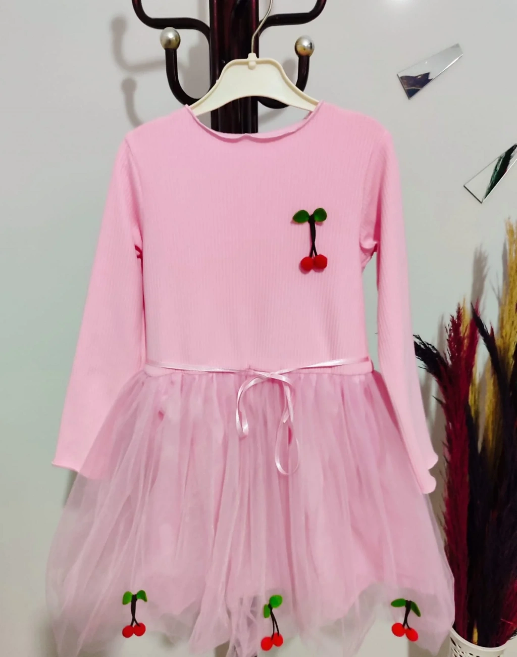 5-6-7 Yaş Kiraz Desenli Kurdela Kuşaklı Astarlı Uzun Kollu Kız Çocuk Tütü Elbise Pembe