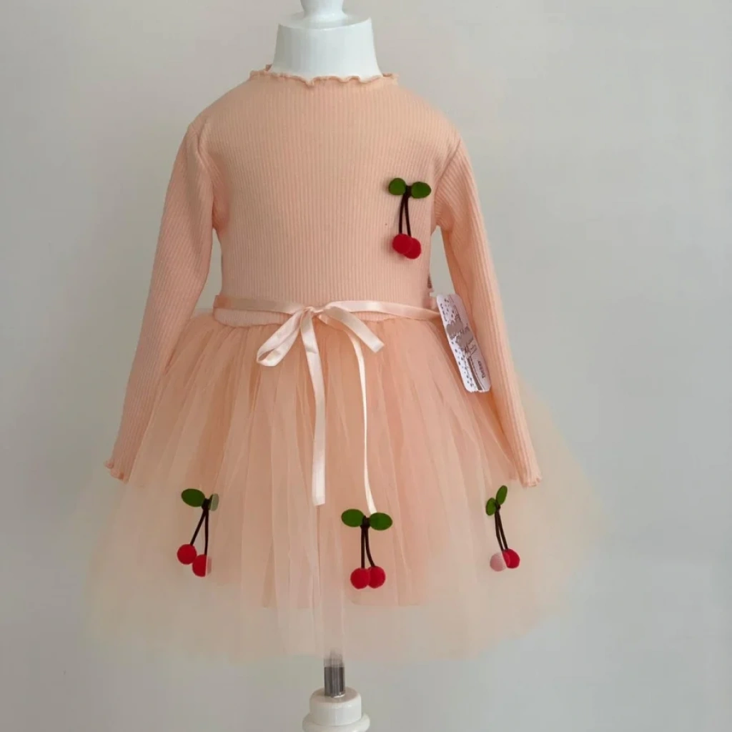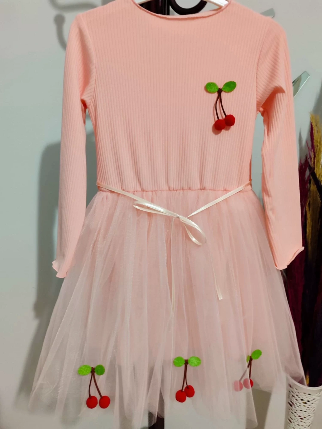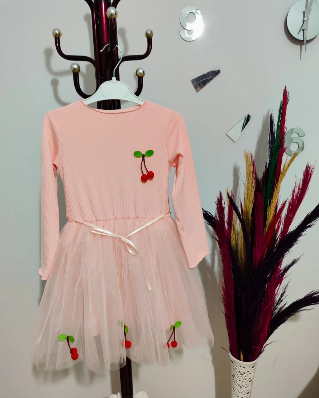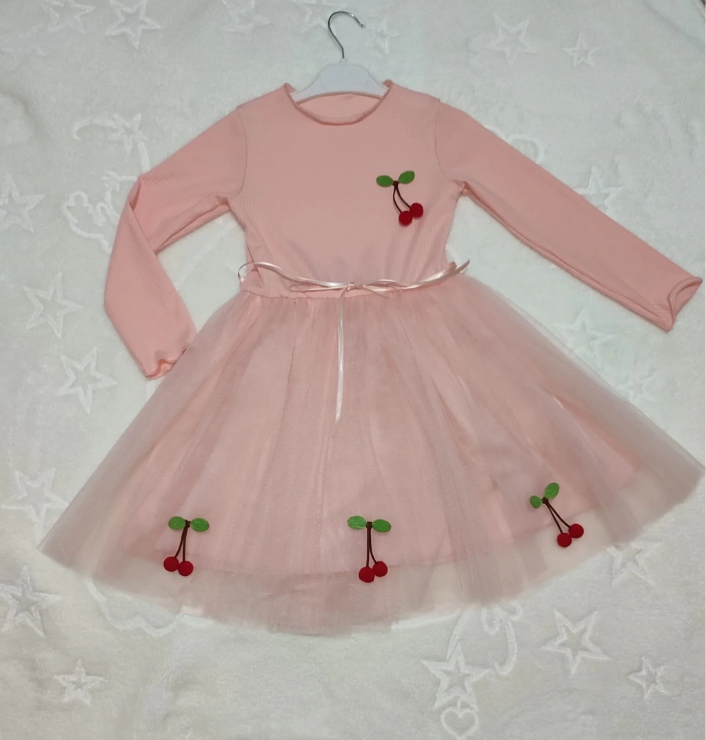 5-6-7 Yaş Kiraz Desenli Kurdela Kuşaklı Astarlı Uzun Kollu Kız Çocuk Tütü Elbise Somon
