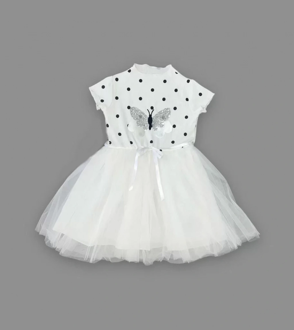 5-6-7 Yaş Payetli Kelebek Desenli Puantiyeli Kız Çocuk Elbisesi Beyaz