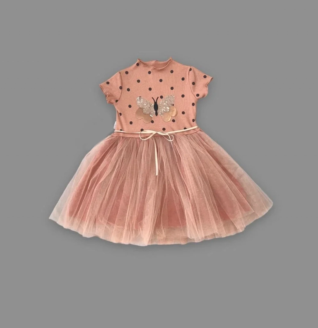 5-6-7 Yaş Payetli Kelebek Desenli Puantiyeli Kız Çocuk Elbisesi Kahverengi