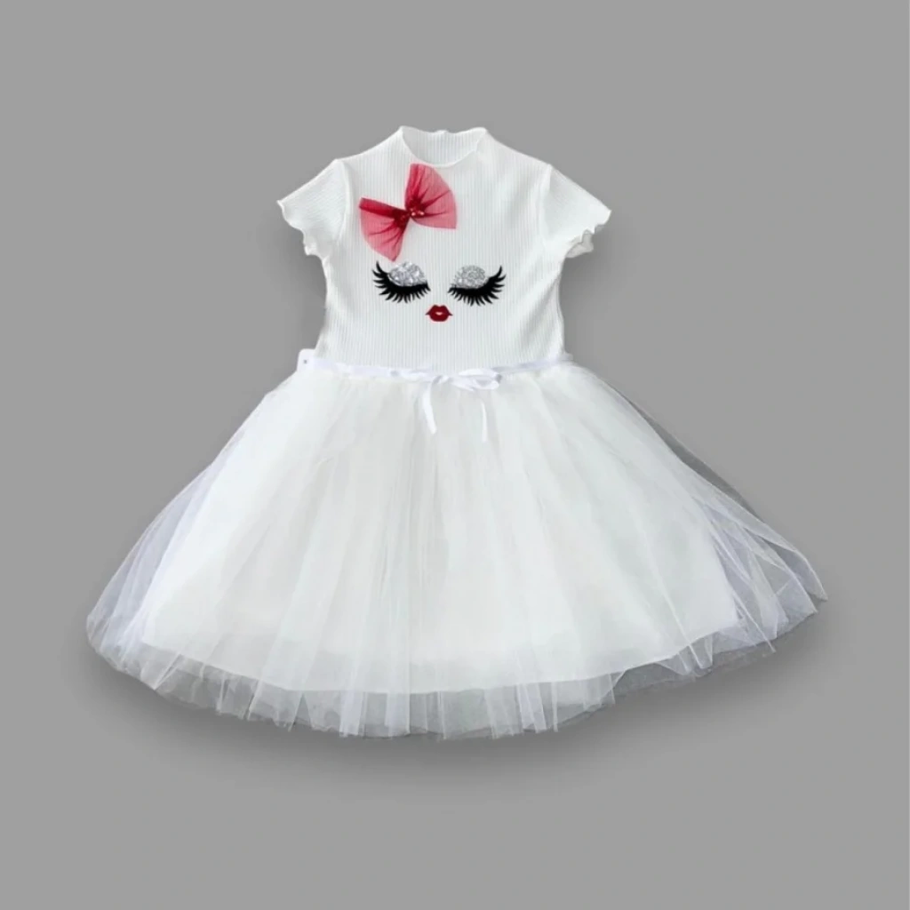 5-6-7 Yaş Payetli Süslü Yüz Baskılı Kız Çocuk Elbisesi Beyaz