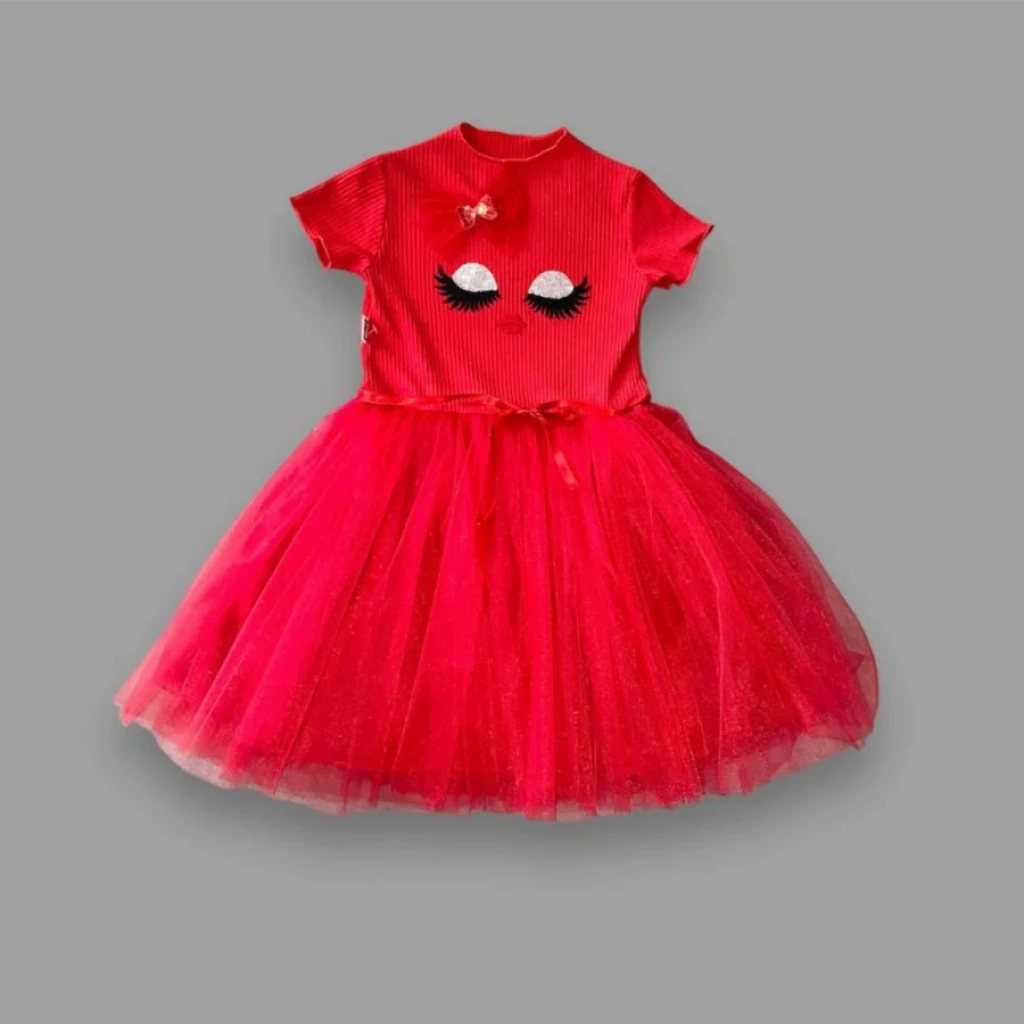 5-6-7 Yaş Payetli Süslü Yüz Baskılı Kız Çocuk Elbisesi Kırmızı