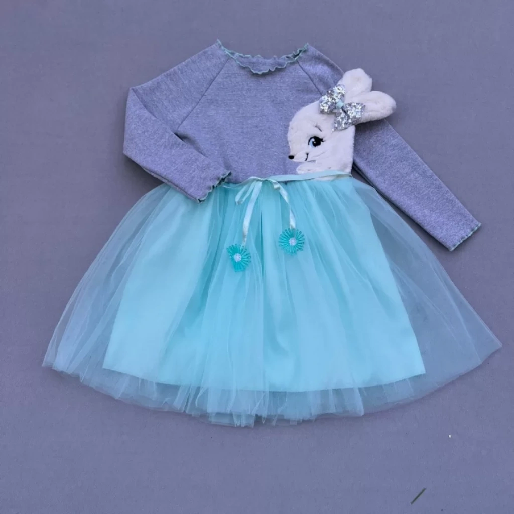 5-6-7 Yaş Pelüş Tavşan Desenli Kurdela Kuşaklı Astarlı Kız Çocuk Tütü Elbise Turkuaz