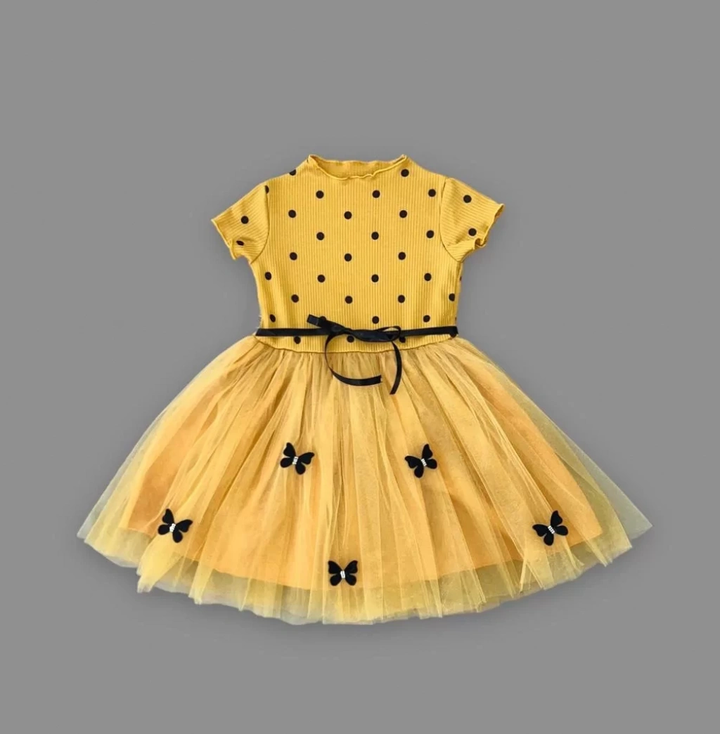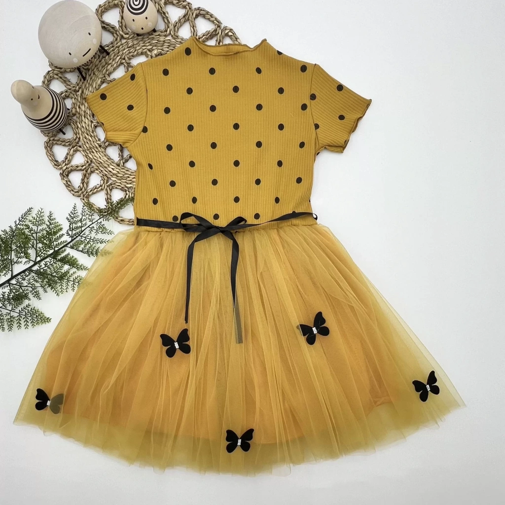 5-6-7 Yaş Puantiyeli Kelebek Etekli Astarlı Kız Çocuk Elbisesi Hardal