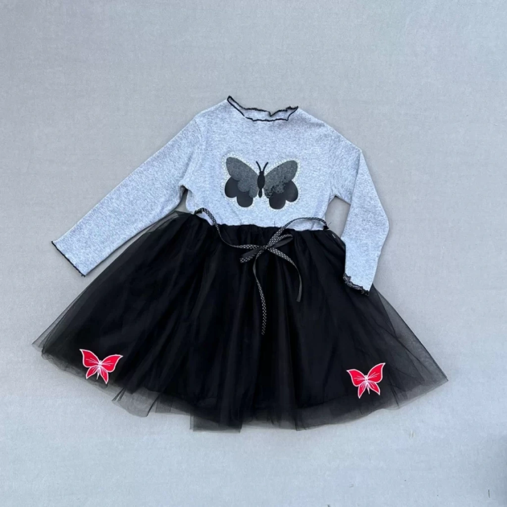 5-6-7 Yaş Taşlı Kelebek Desenli Kurdela Kuşaklı Astarlı Kız Çocuk Tütü Elbise Siyah