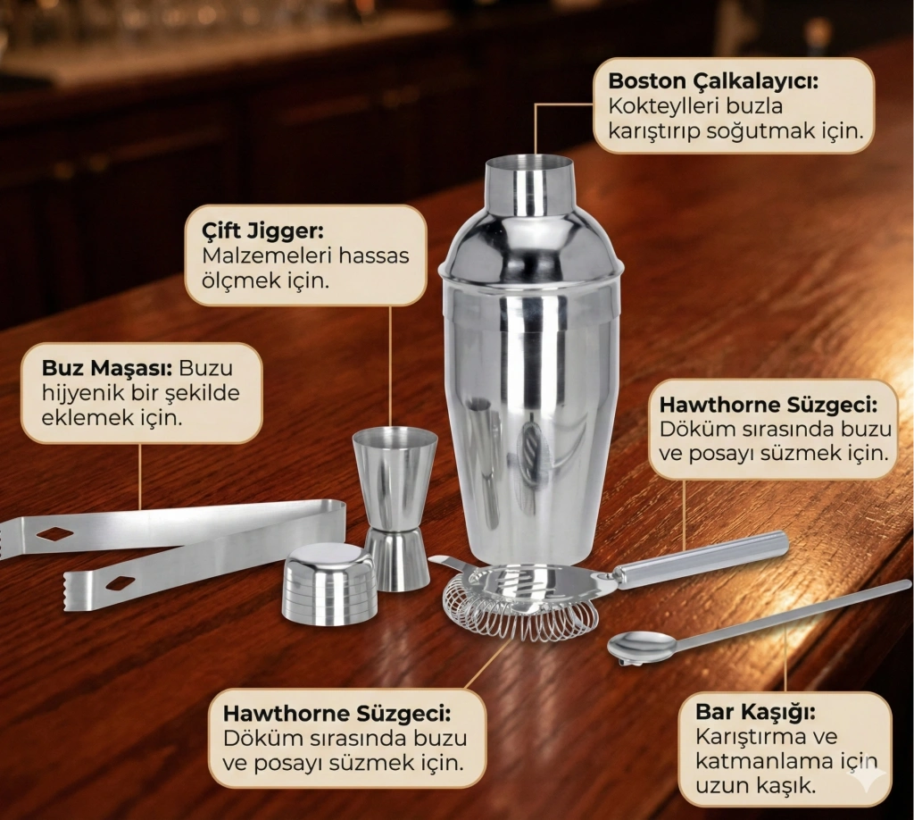 Kokteyl seti tüm gerekli araçlara sahiptir,