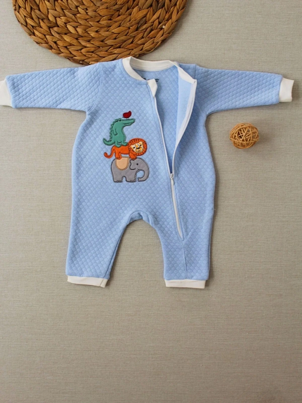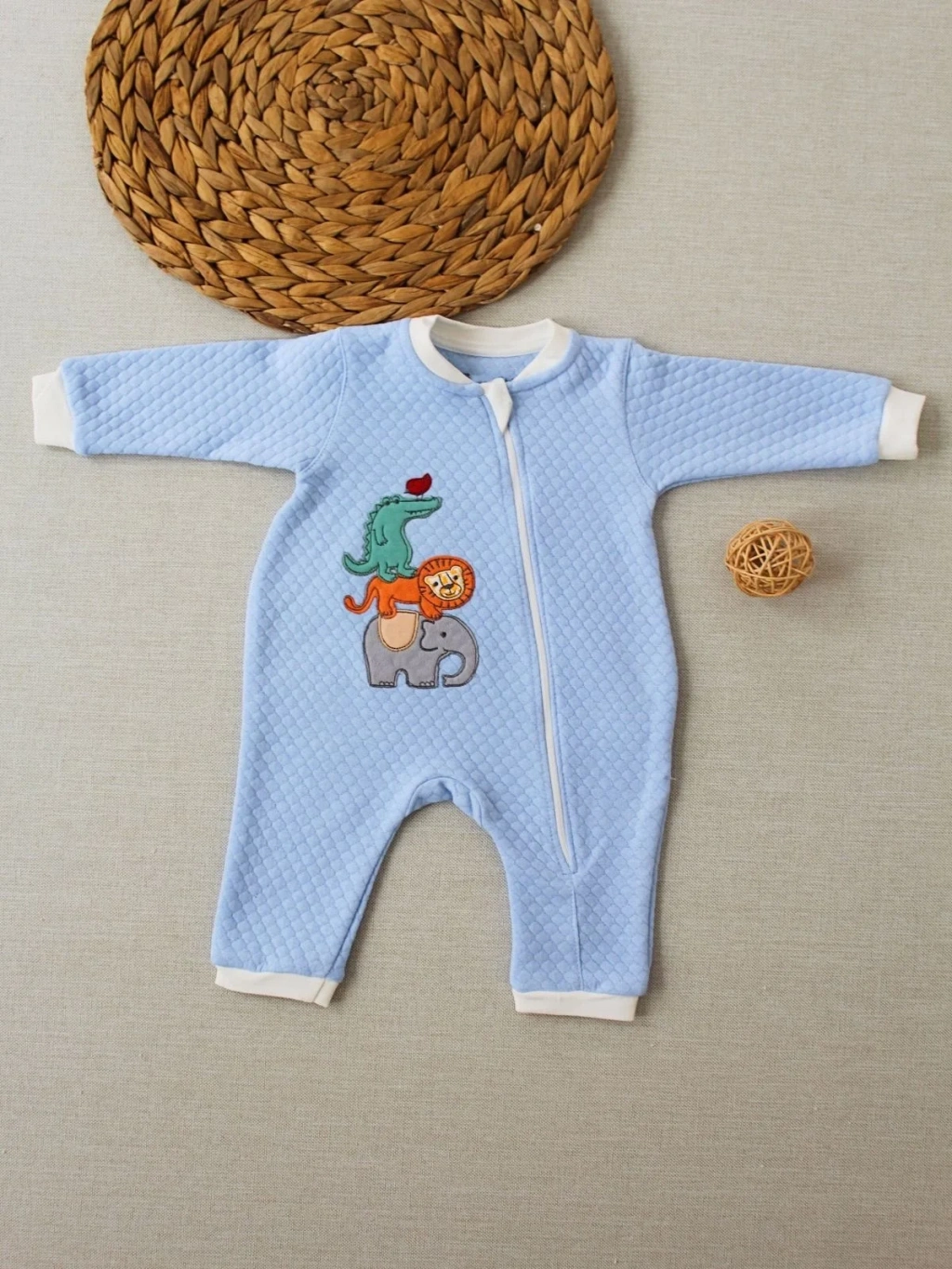 6-9 12-18 18-24 24-36 Ay Animal Nakışlı Bal Peteği Kumaş Es Fermuarlı Erkek Bebek Tulumu Mavi