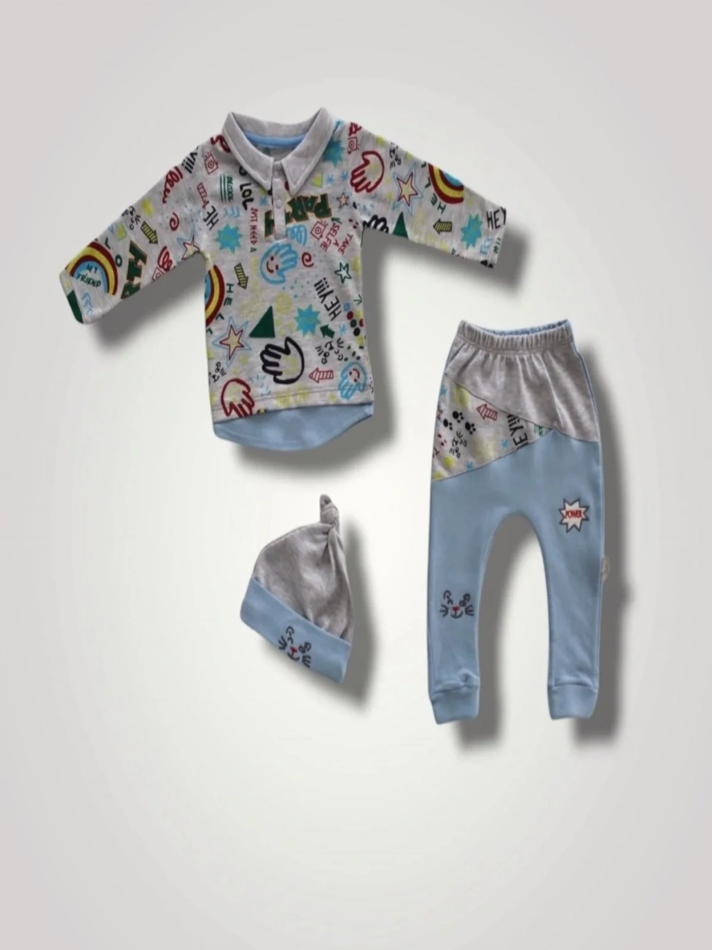 6-9 12-18 18-24 Ay Power Kedi Nakışlı Uzun Kollu Sweat Şapkalı 3lü Kız Erkek Bebek Takımı Mavi