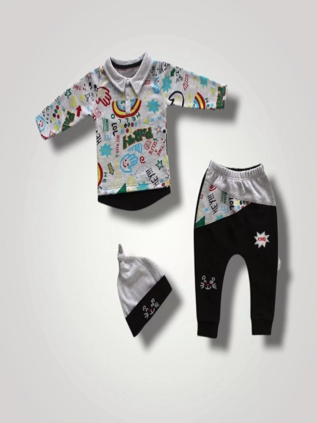 6-9 12-18 18-24 Ay Power Kedi Nakışlı Uzun Kollu Sweat Şapkalı 3lü Kız Erkek Bebek Takımı Siyah
