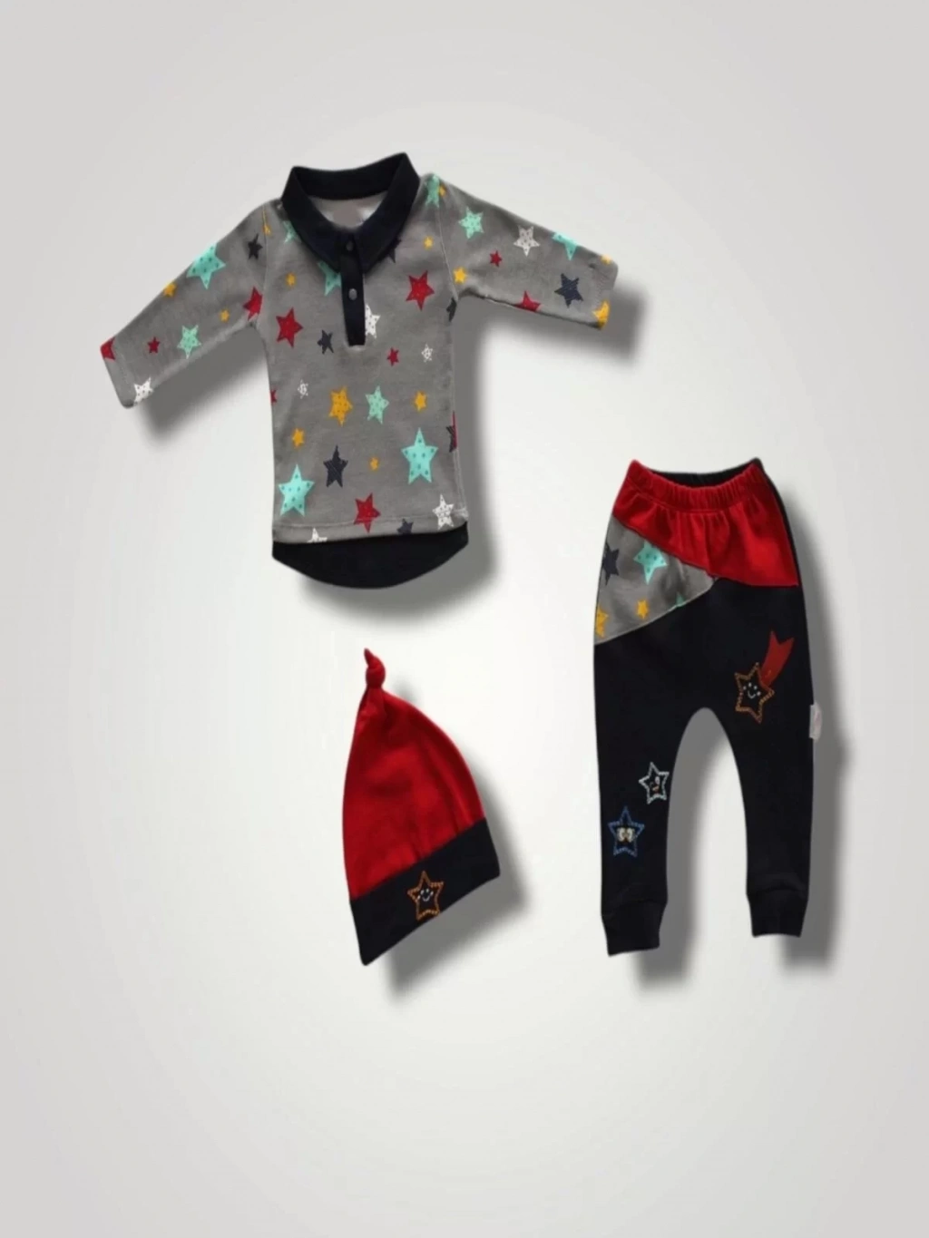 6-9 12-18 18-24 Ay Samanyolu Yıldızlar Baskılı Uzun Kollu Sweat Şapkalı 3lü Kız Erkek Bebek Takımı Lacivert