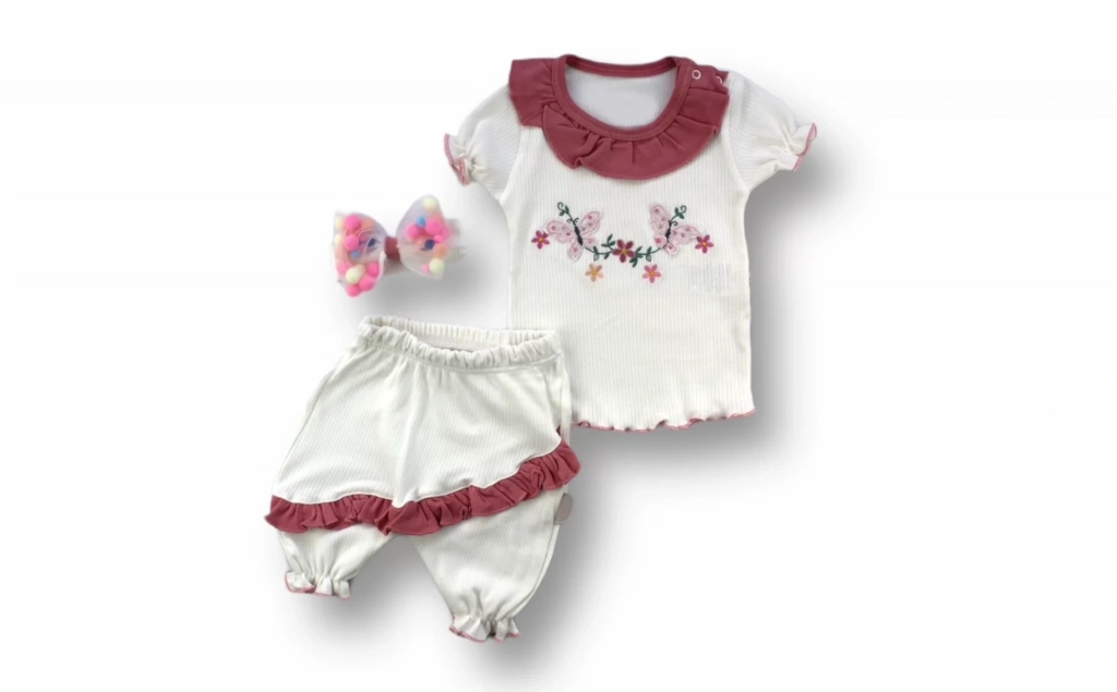 6-9 9-12 12-18 Ay Çiçek Nakışlı Roman Şalvar Bandanalı Kısa Kollu Sweat 3lü Kız Bebek Takımı Nar Çiçeği