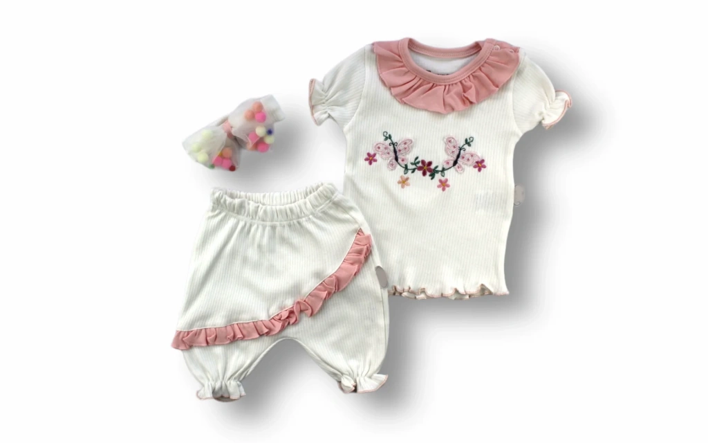 6-9 9-12 12-18 Ay Çiçek Nakışlı Roman Şalvar Bandanalı Kısa Kollu Sweat 3lü Kız Bebek Takımı Pudra