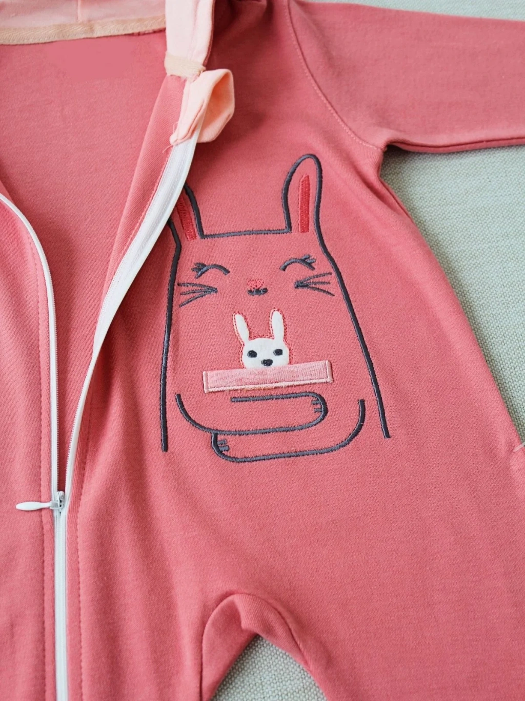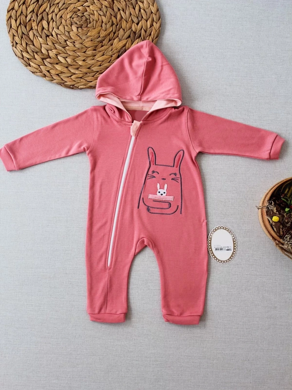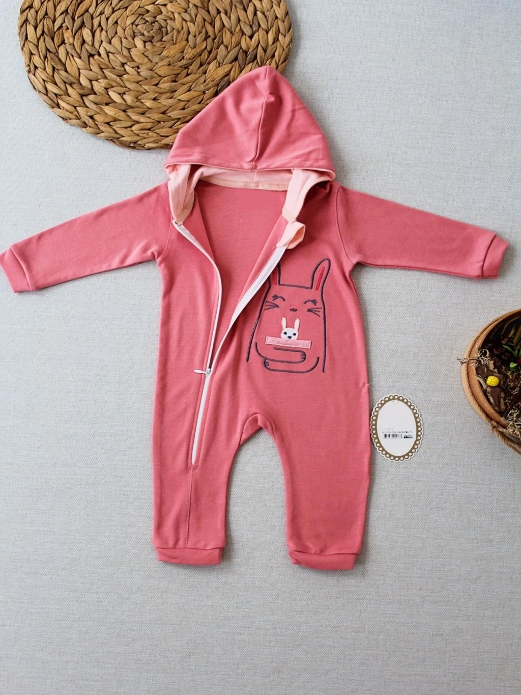 6-9 9-12 Ay Ef Çizgi Boy Fermuarlı Tavşan Nakışlı Kapşonlu Kız Erkek Bebek Tulumu Gül Kurusu