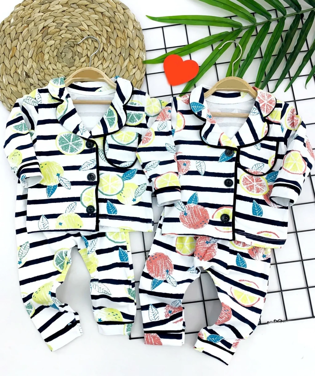 9-12-18-24 Ay Çizgili Meyve Desenli Düğme Kapamalı 2li Kız Erkek Bebek Pijama Takımı Sarı